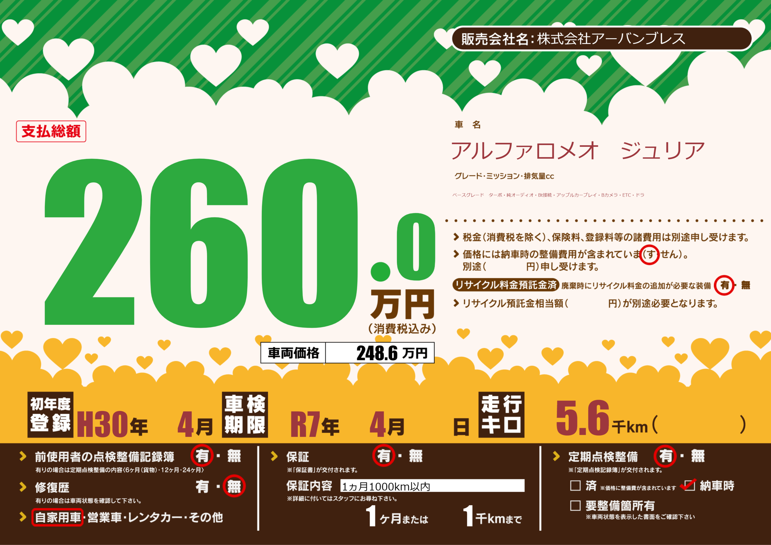 | 車名 | アルファロメオ ジュリア | グレード ミッション 排気量 |