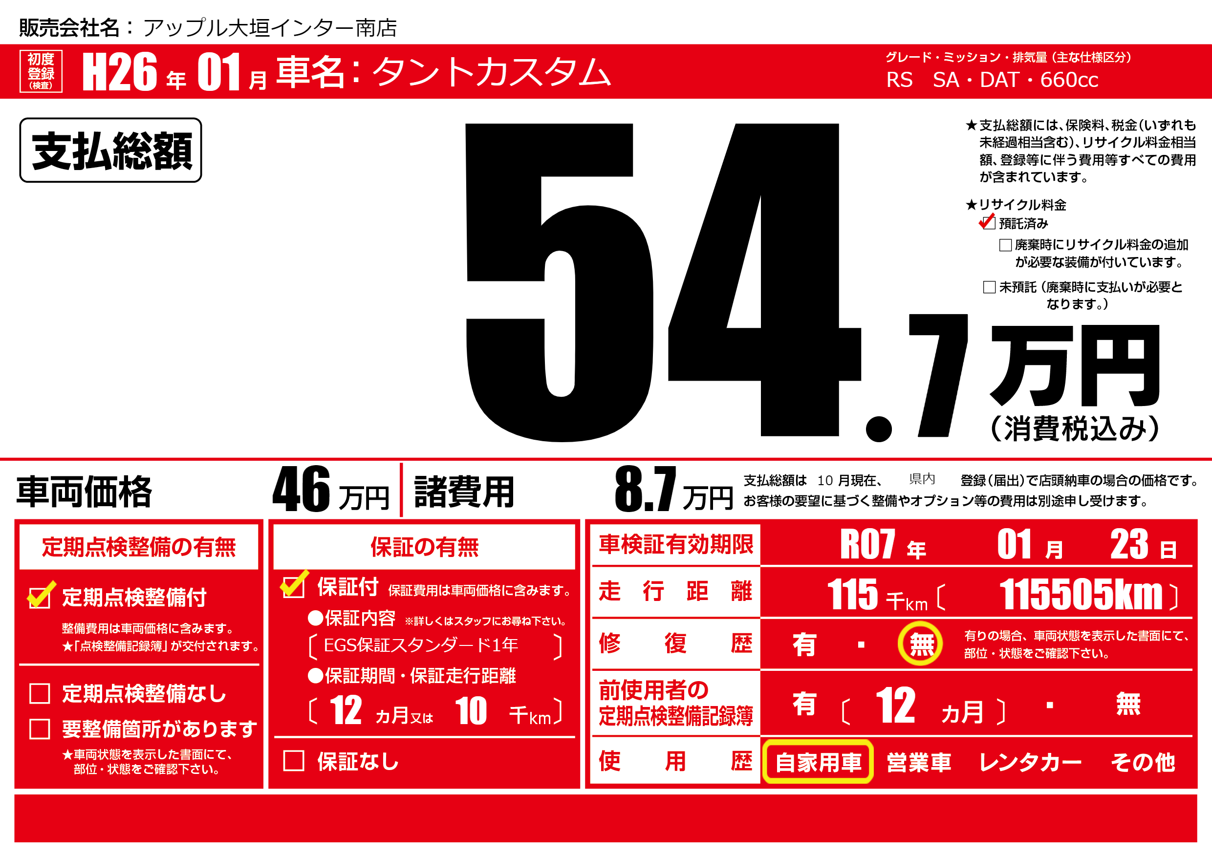 | 車名 | タントカスタム | グレード ミッション 排気量 |