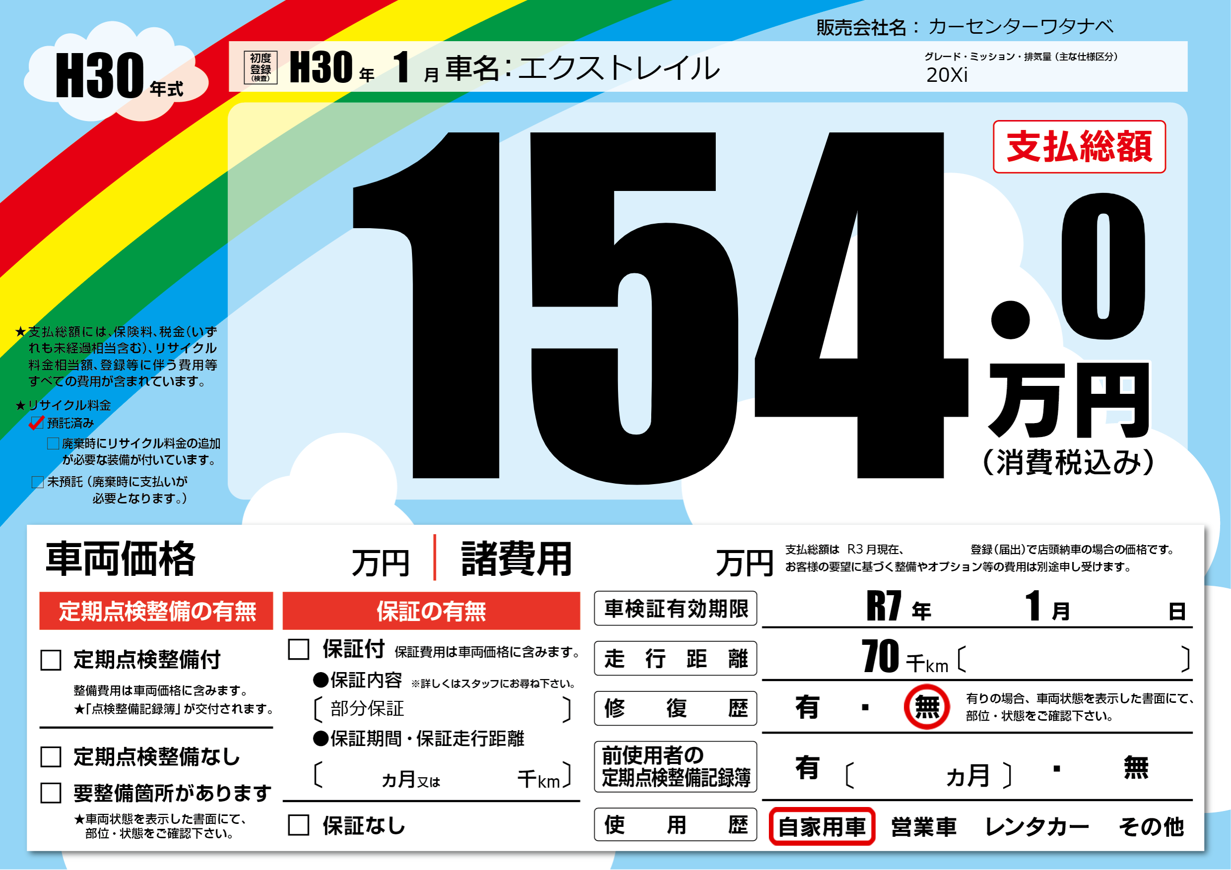 | 走行キロ | 7万km | 初年度登録 | H30年1月 |