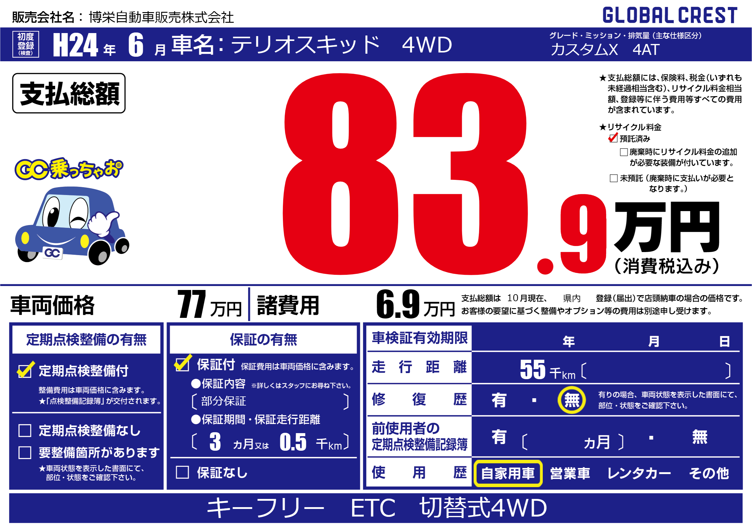 | 車名 | テリオスキッド 4WD | グレード ミッション 排気量 |