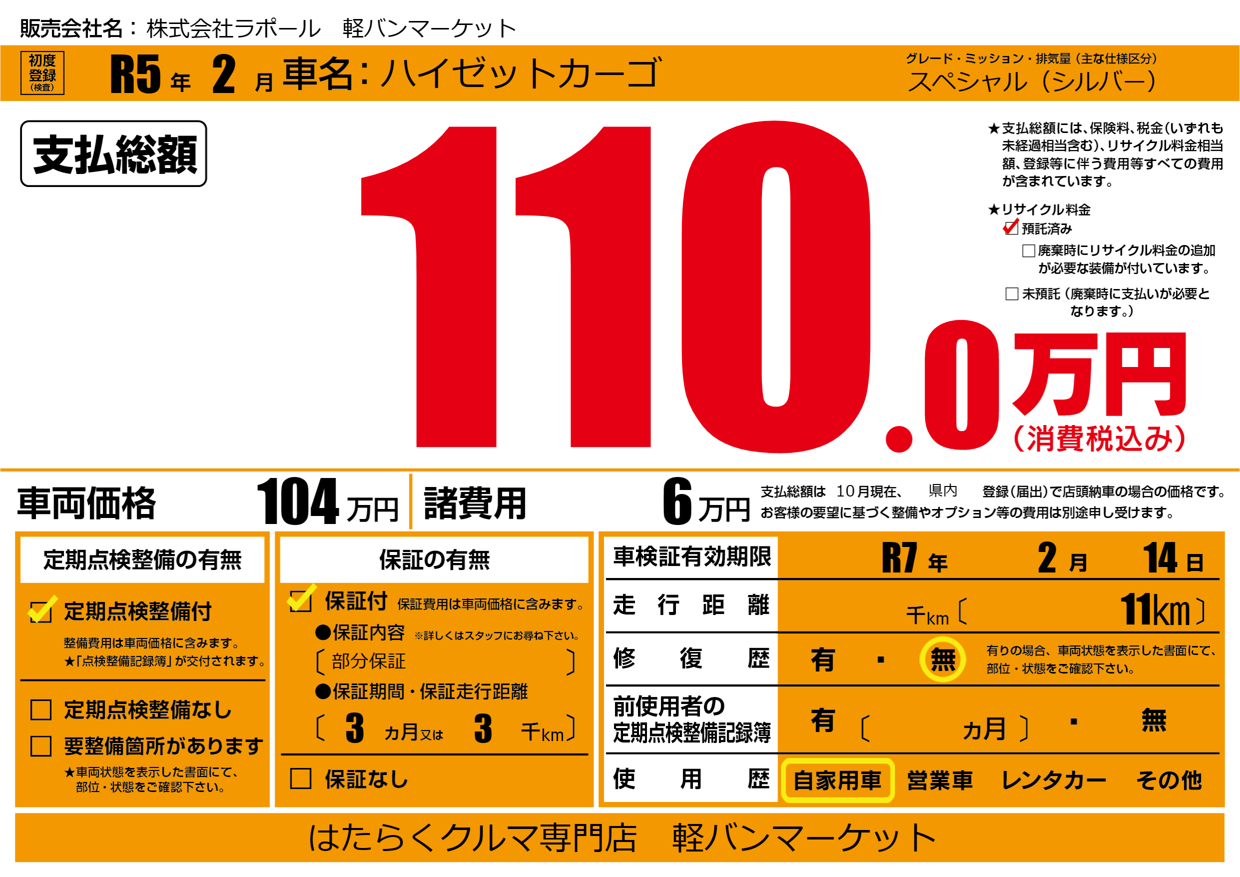 保証付き 保証内容(部分保証) 3ヶ月または(3)千kmまで |