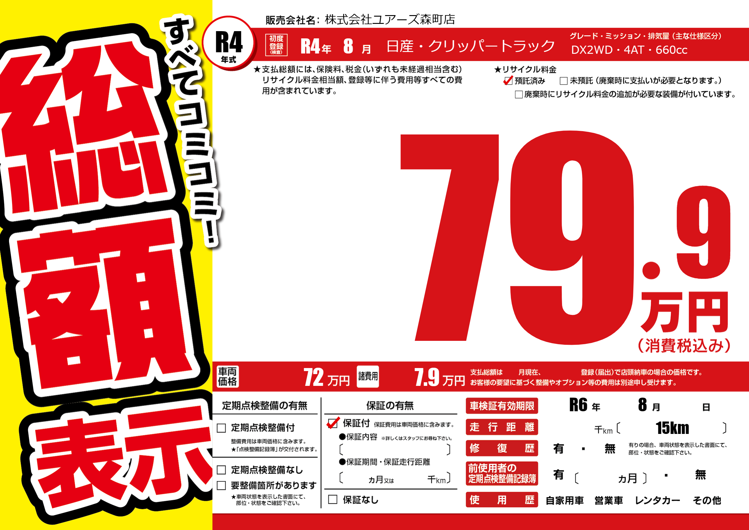 | 車名 | 日産・クリッパートラック | グレード ミッション 排気量 |