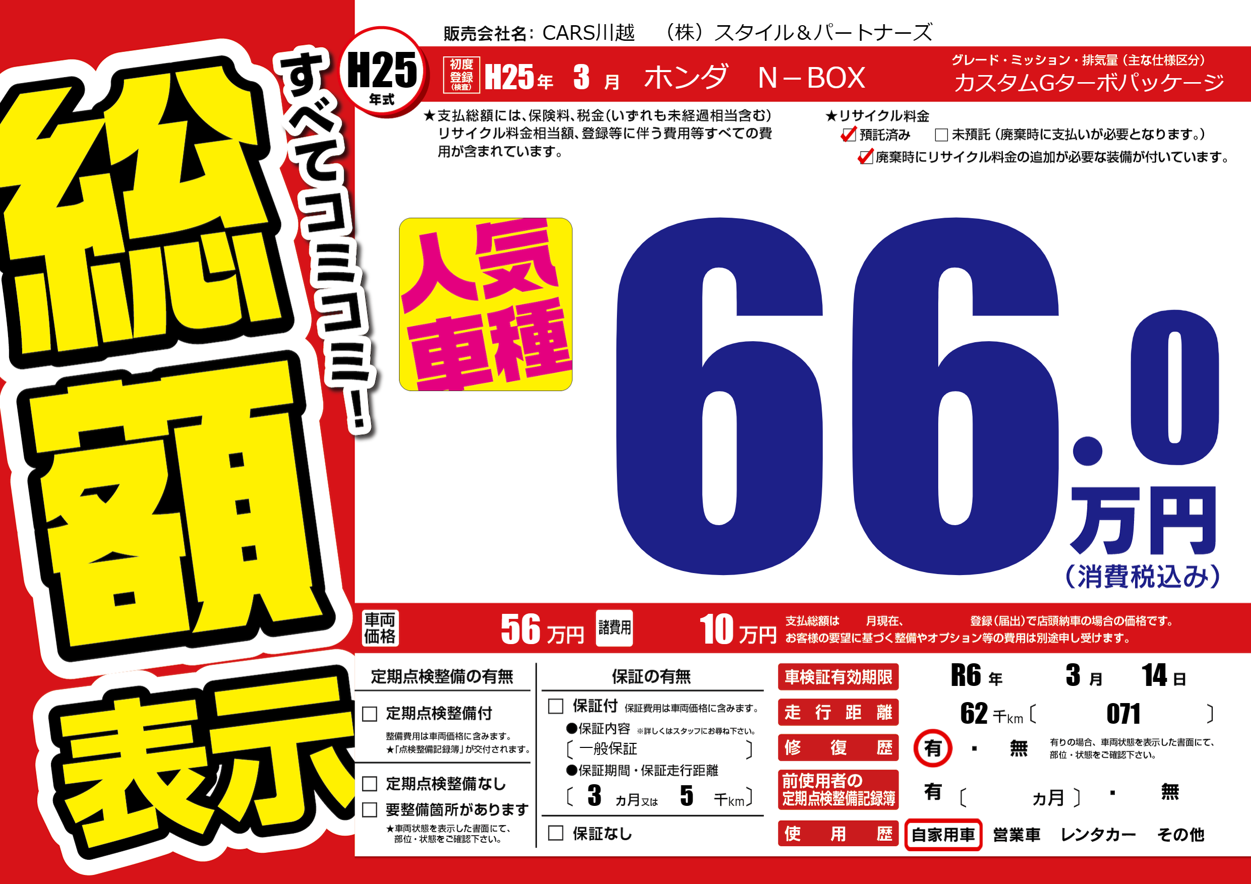 | 車名 | ホンダ N-BOX | グレード ミッション 排気量 |