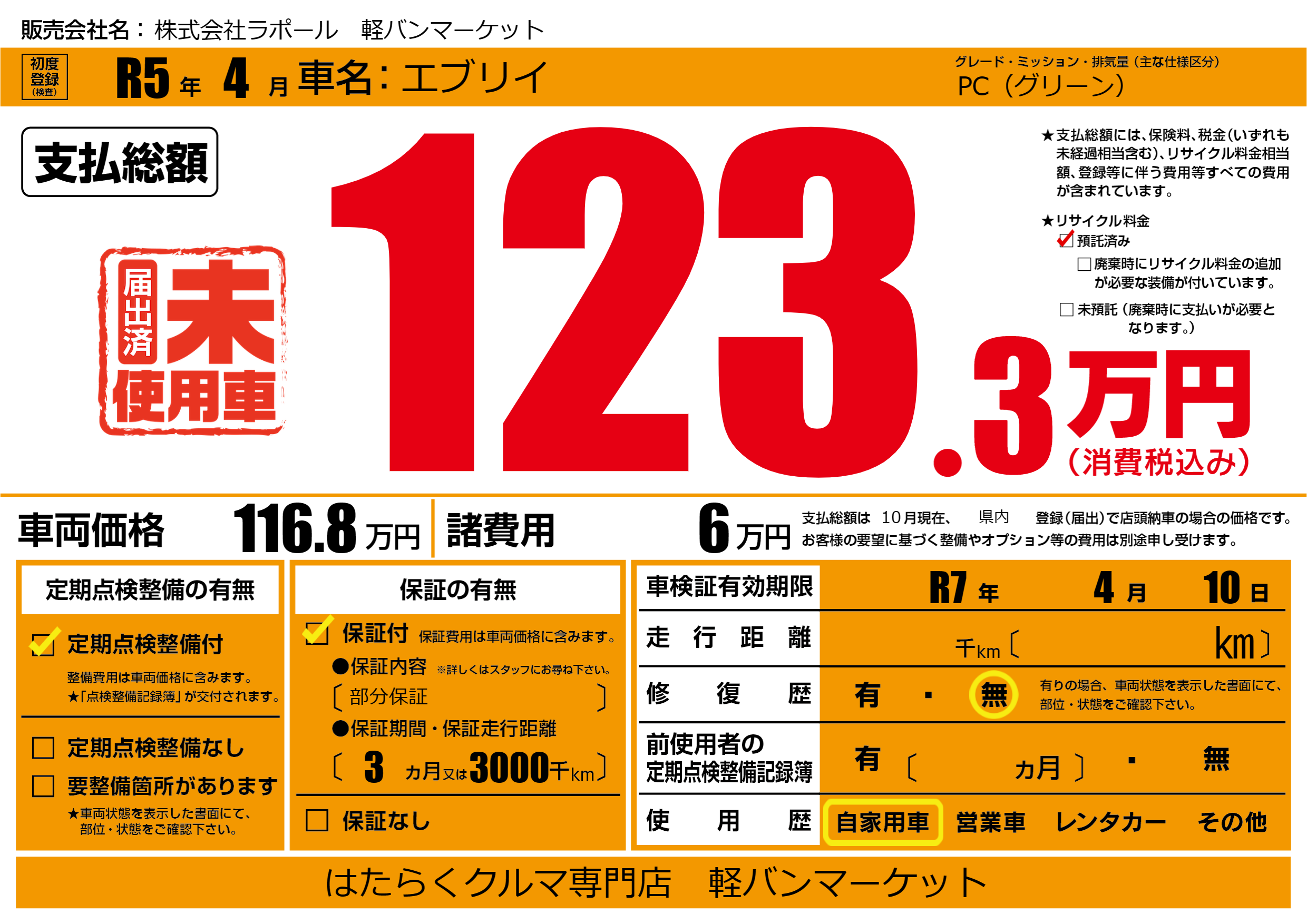 なし | 車検制限 | R7年4月10月 |