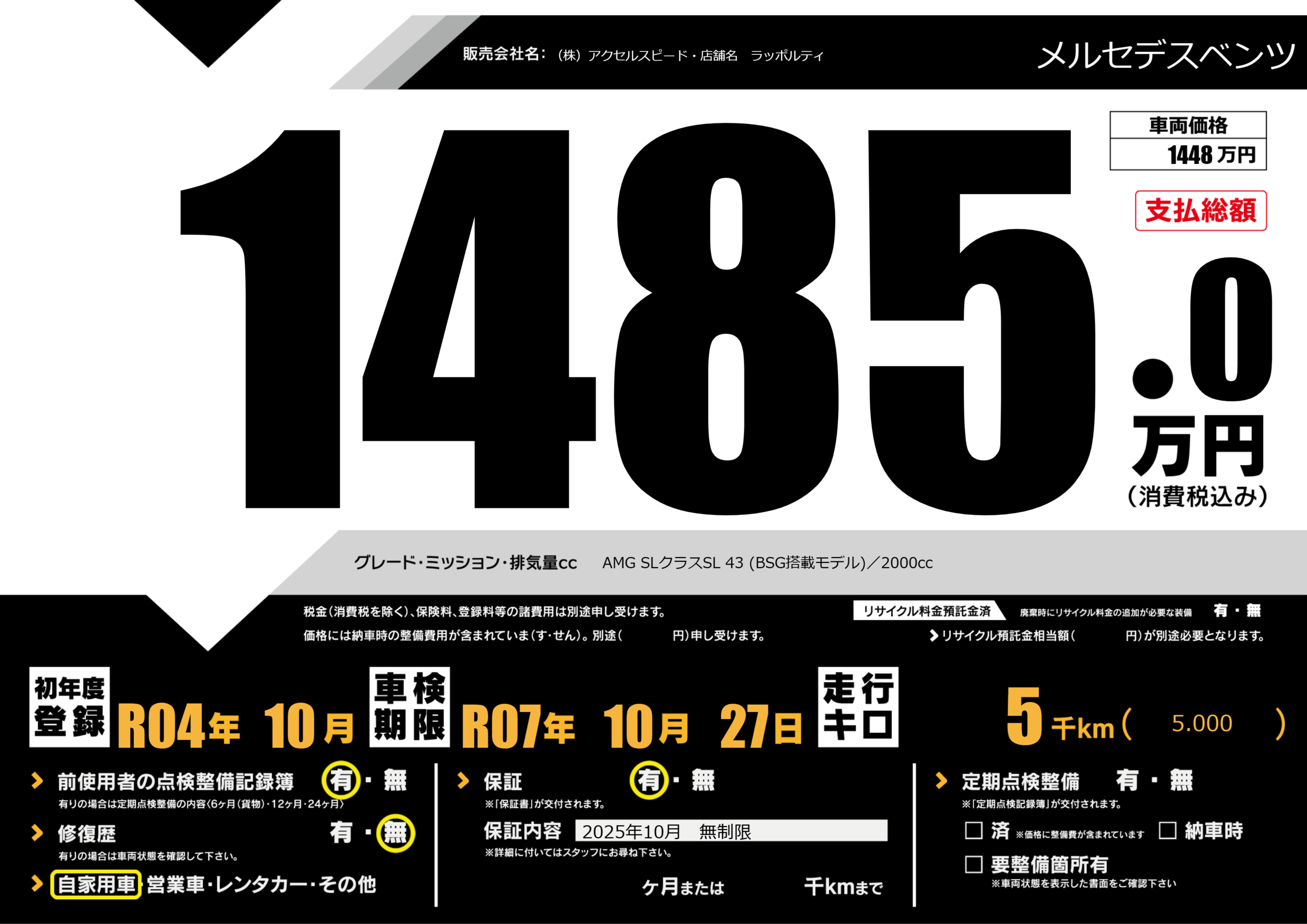 保証付き 保証内容(2025年10月 無制限) ---ヶ月または()千kmまで |