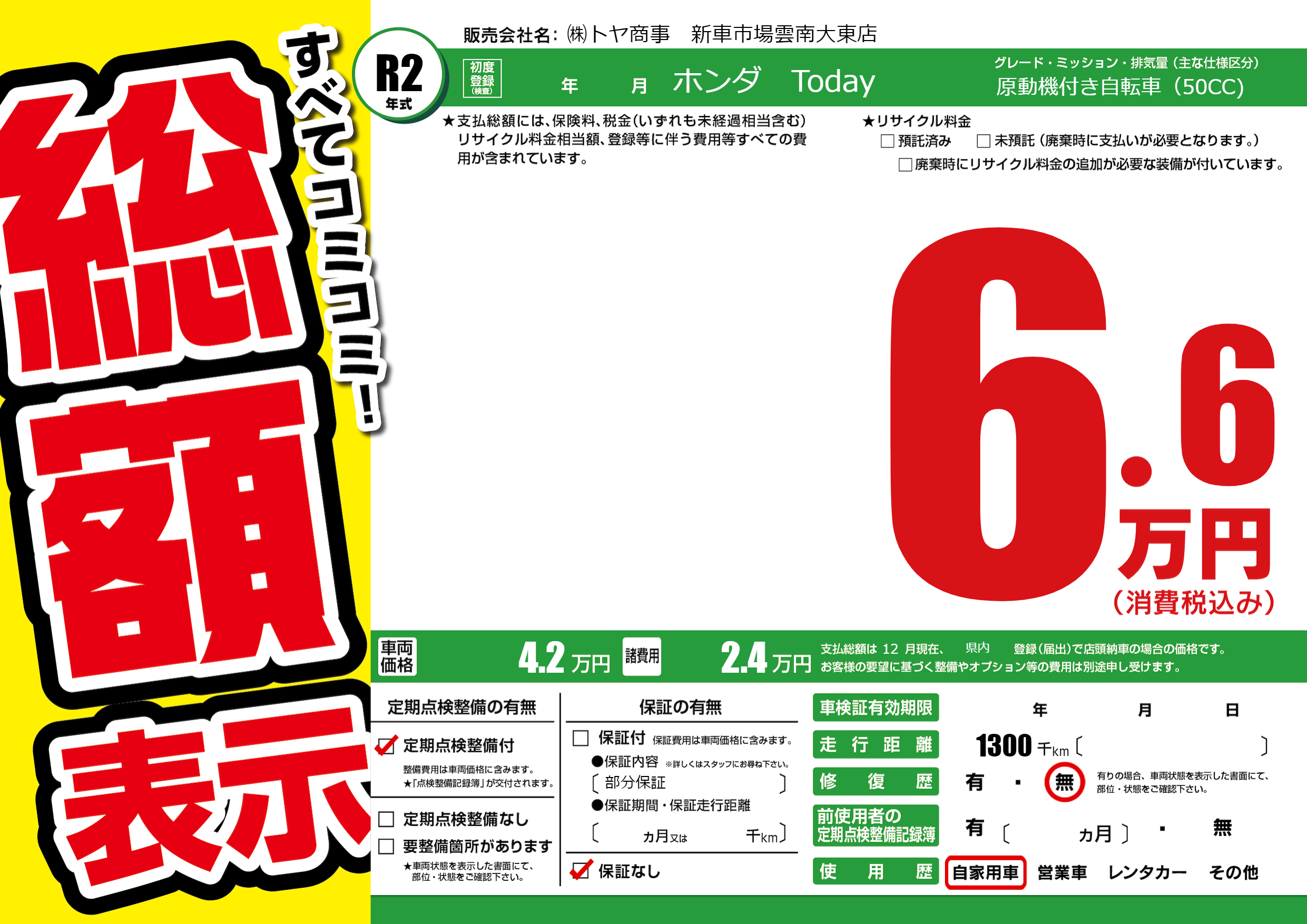 | 車名 | ホンダ Today | グレード ミッション 排気量 |