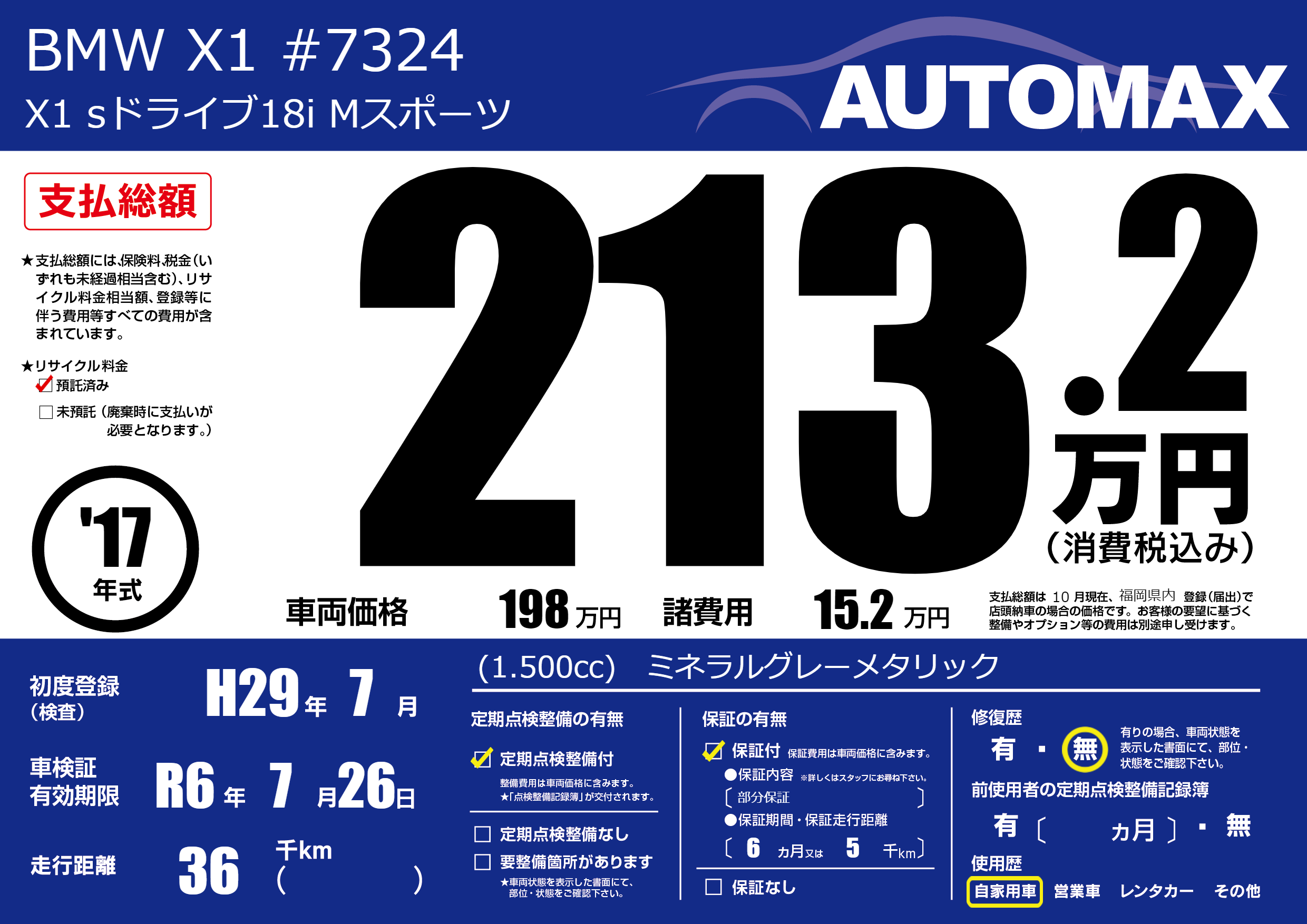 | 車名 | BMW X1 #7324 | グレード ミッション 排気量 |
