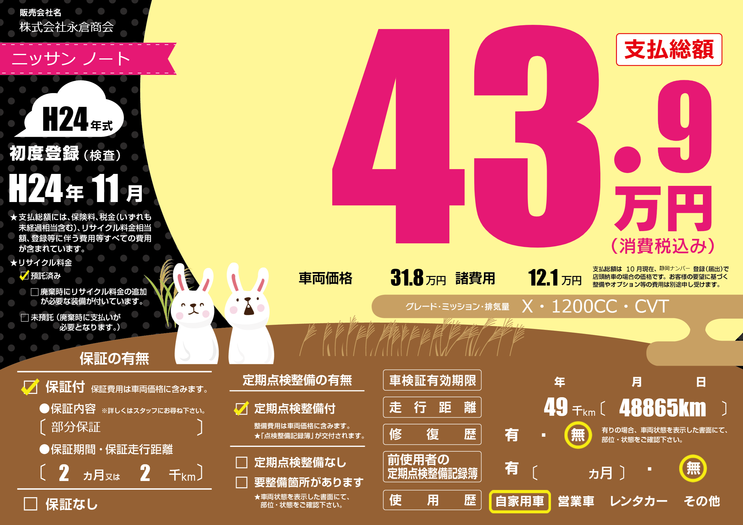 | 走行キロ | 4.9万km | 初年度登録 | H24年11月 |
