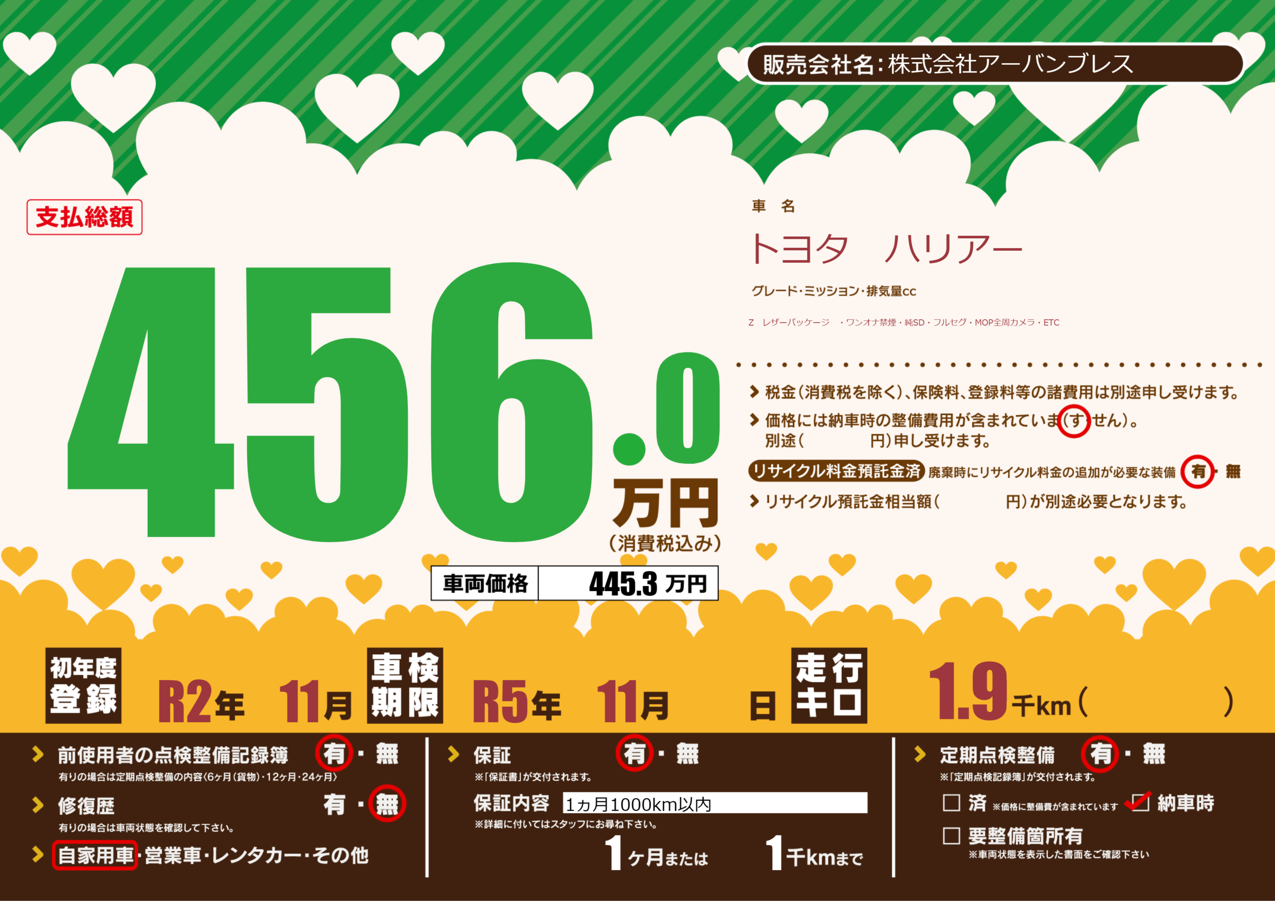 | 車名 | トヨタ ハリアー | グレード ミッション 排気量 |