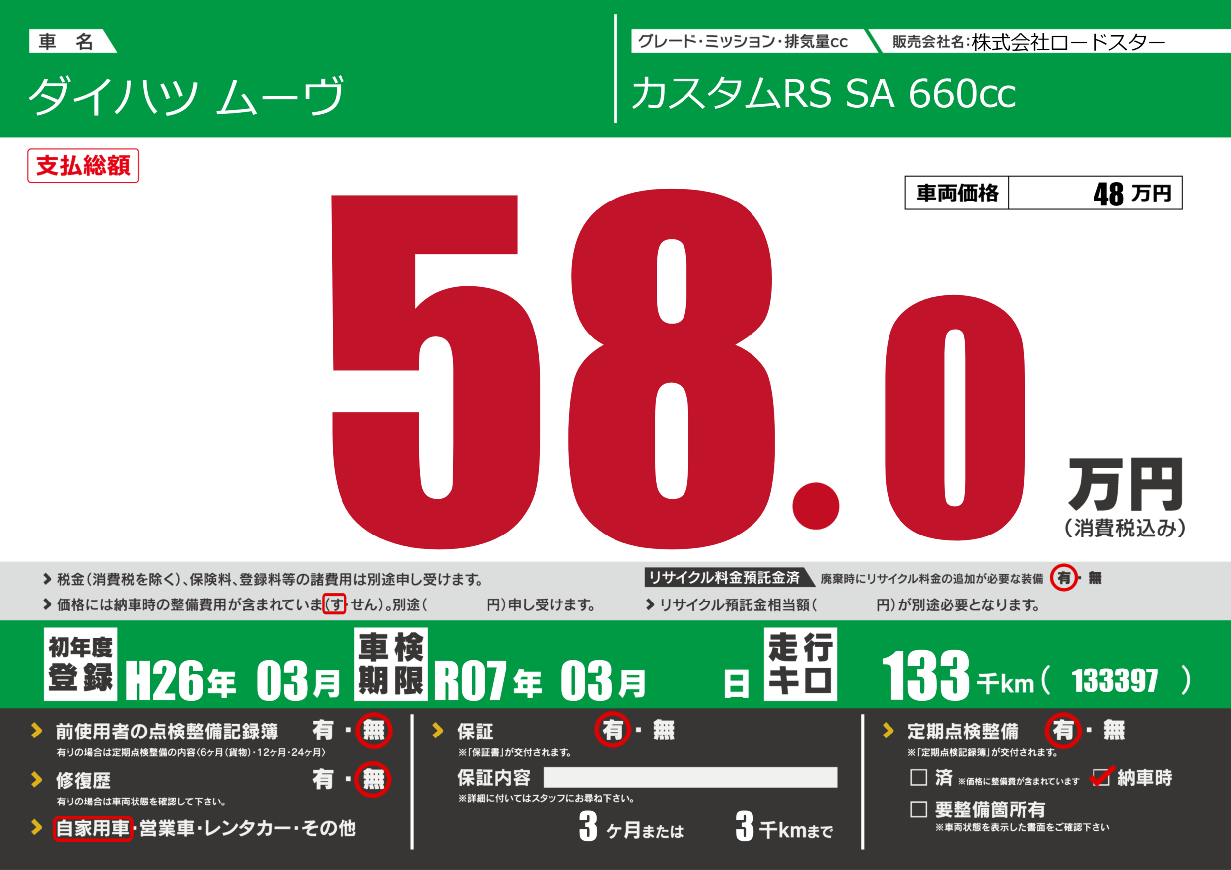 | 走行キロ | 13.3万km | 初年度登録 | H26年03月 |