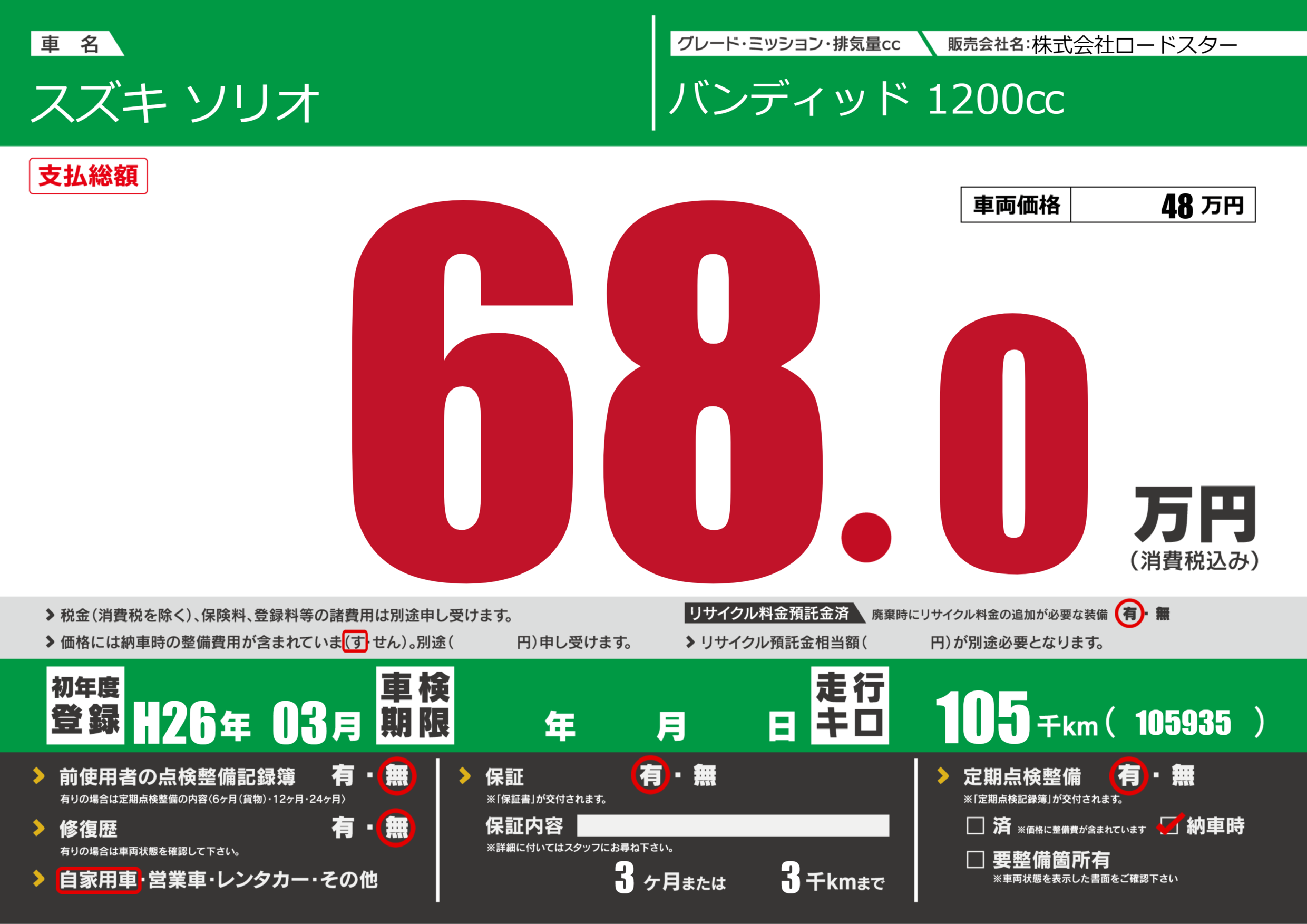| 定期点検整備 | 定期点検整備あり 納車時あり | ||
