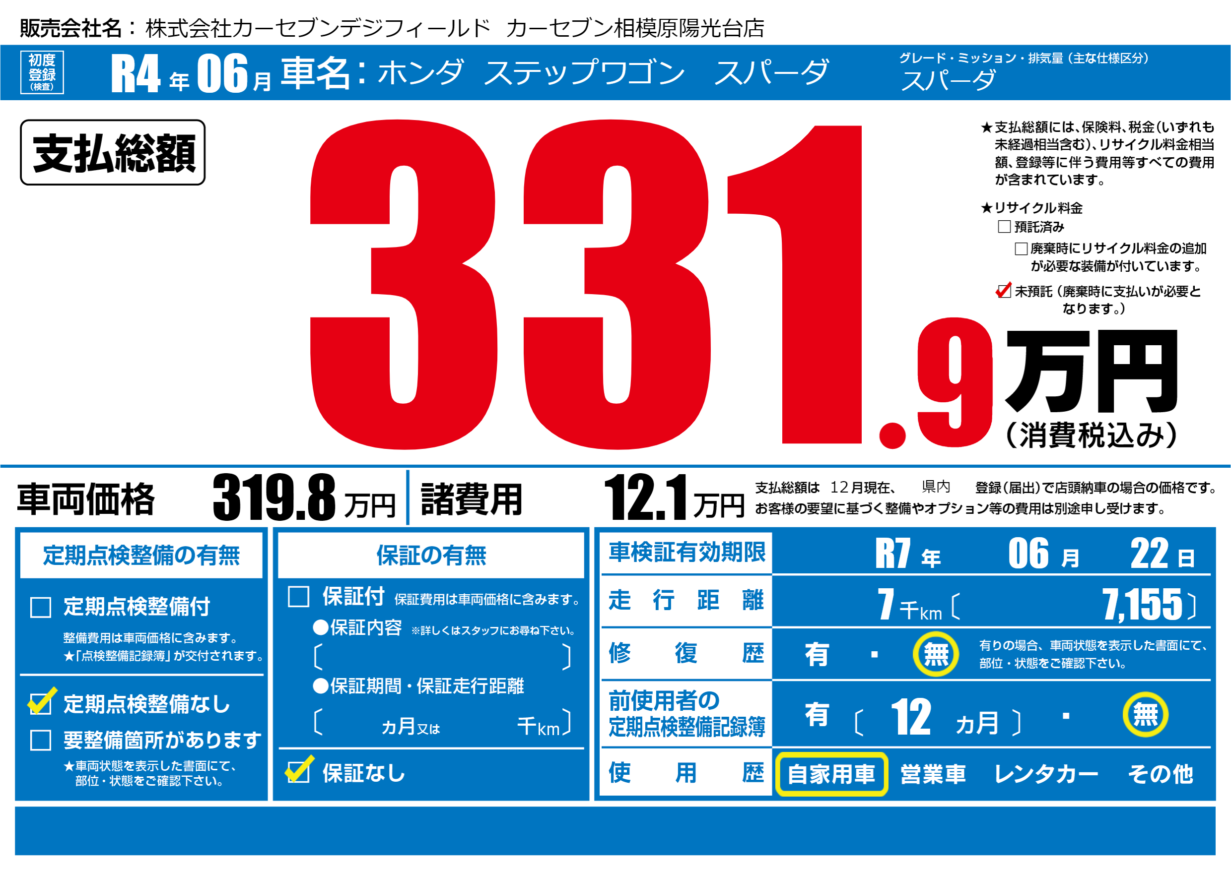 なし | 車検制限 | R7年06月22月 |