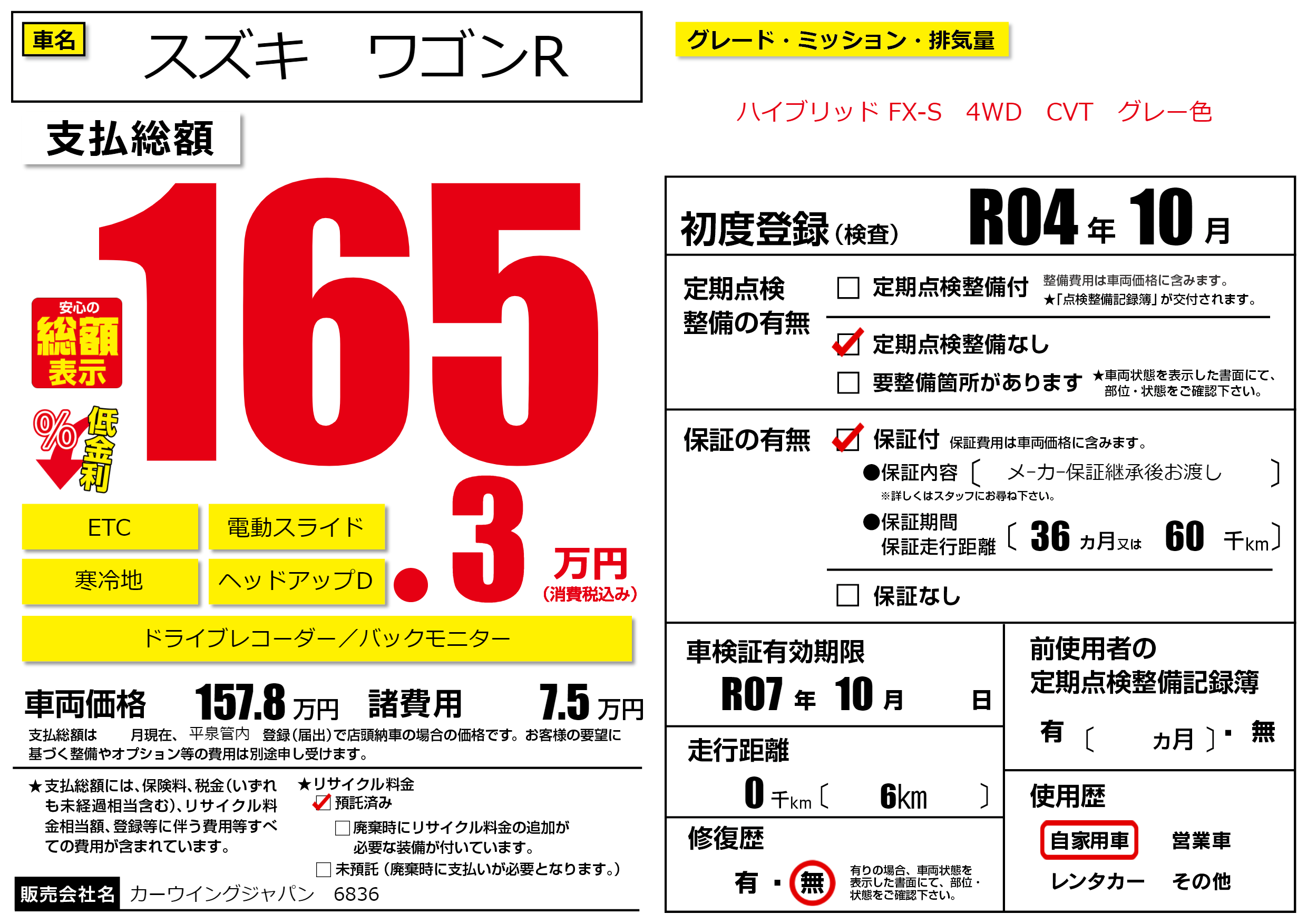 | 車名 | スズキ ワゴンR | グレード ミッション 排気量 |