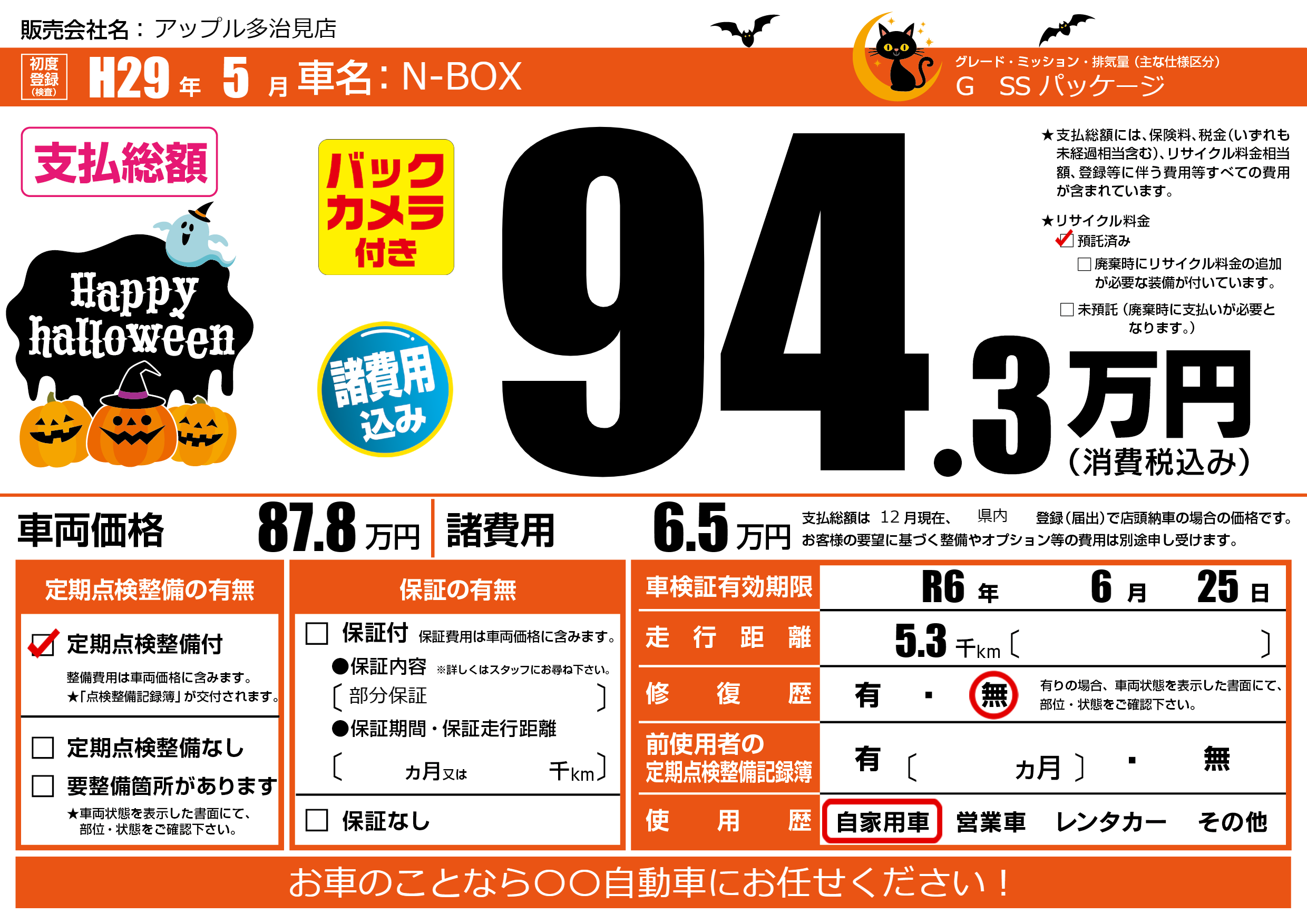 | 車名 | N-BOX | グレード ミッション 排気量 |