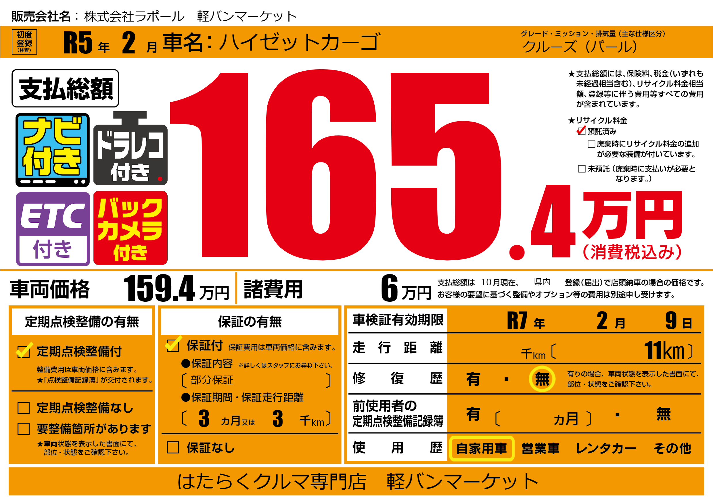 なし | 車検制限 | R7年2月9月 |