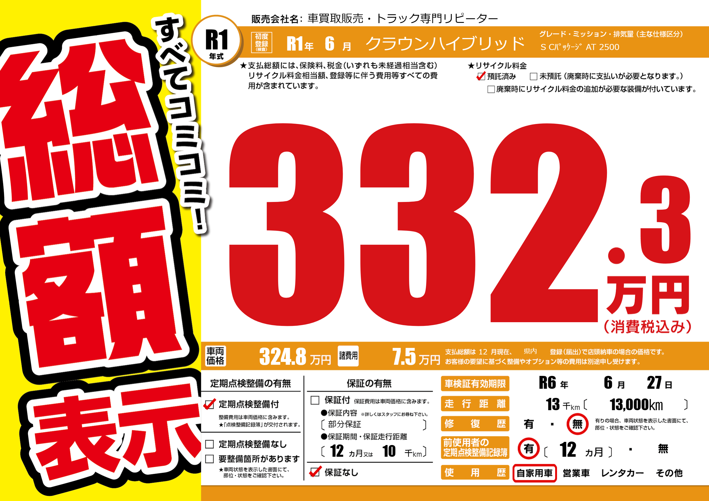 | 車名 | クラウンハイブリッド | グレード ミッション 排気量 |
