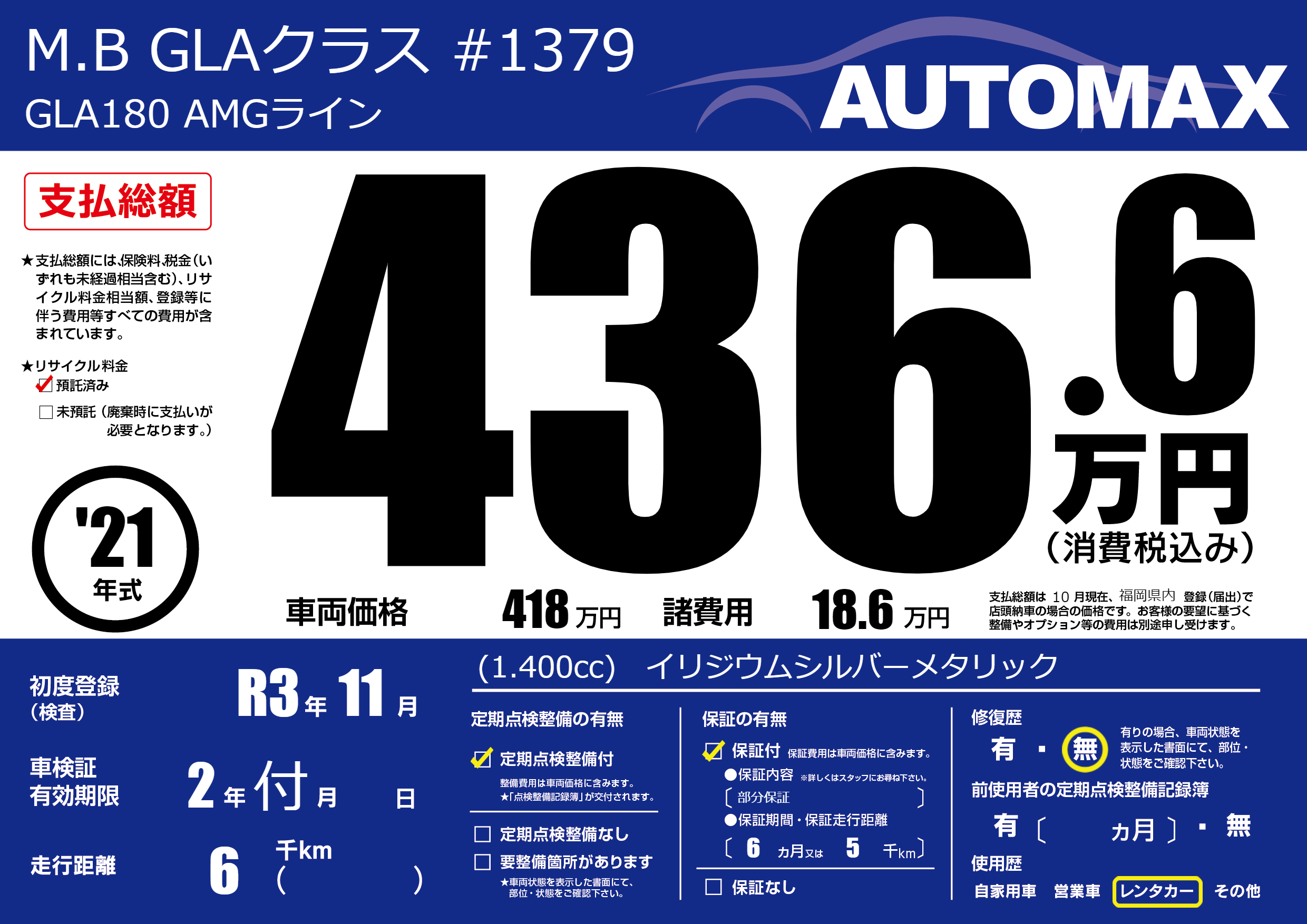| 車名 | M.B GLAクラス #1379 | グレード ミッション 排気量 |