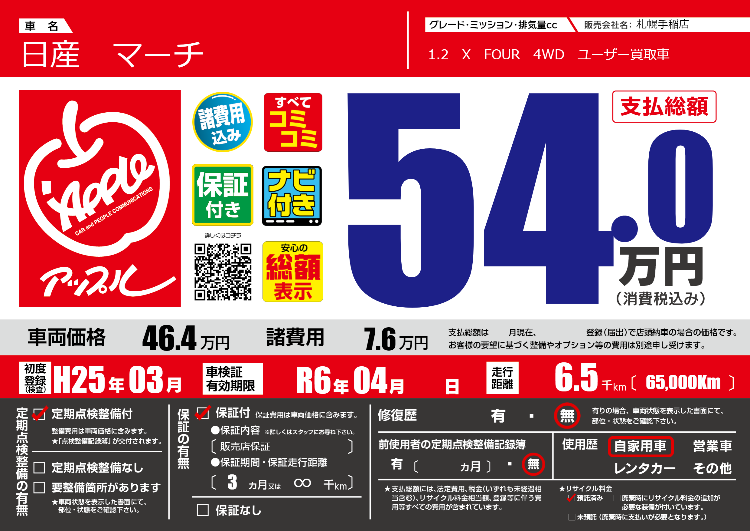 | 車名 | 日産 マーチ | グレード ミッション 排気量 |