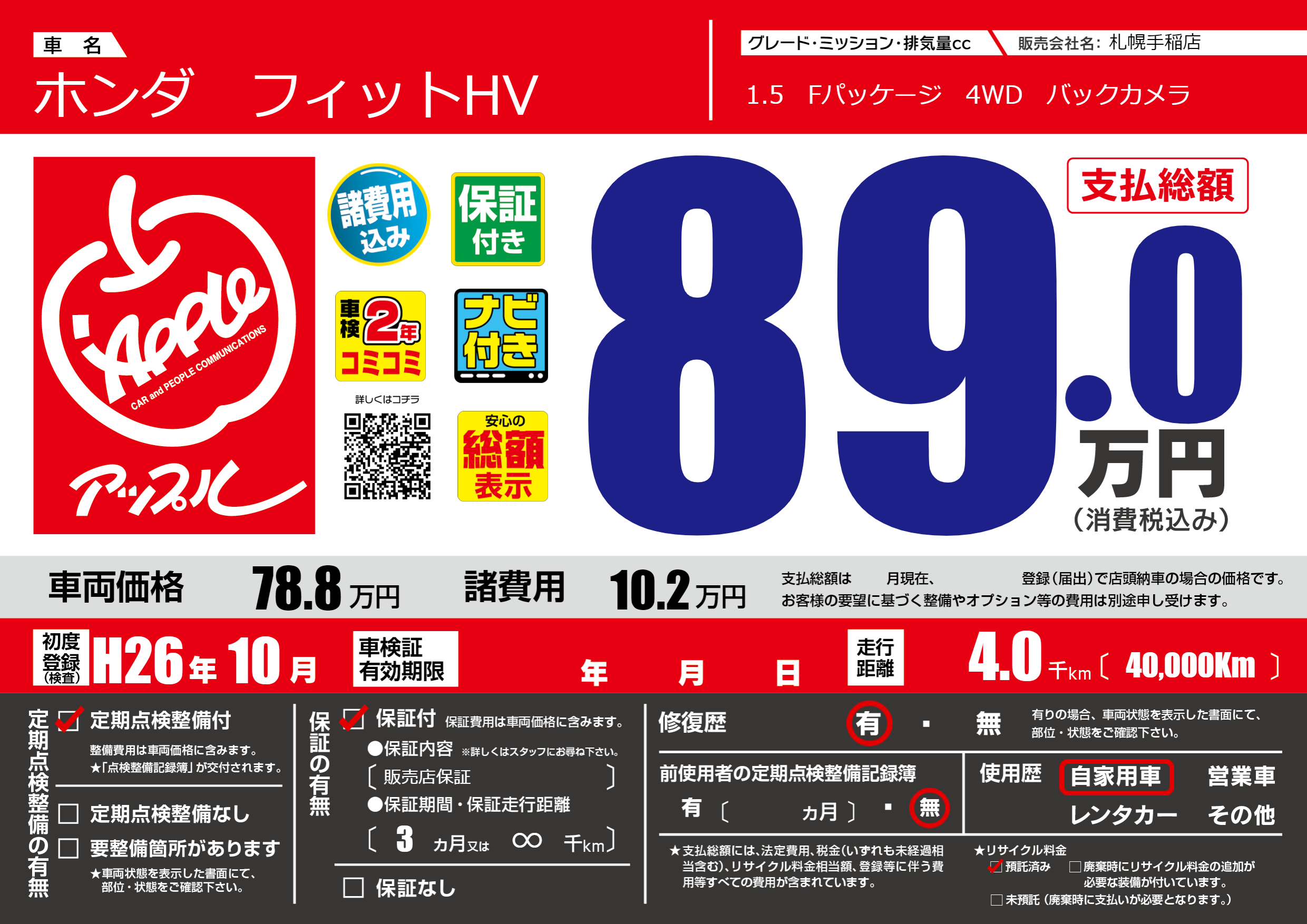 | 走行キロ | 0.4万km | 初年度登録 | H26年10月 |
