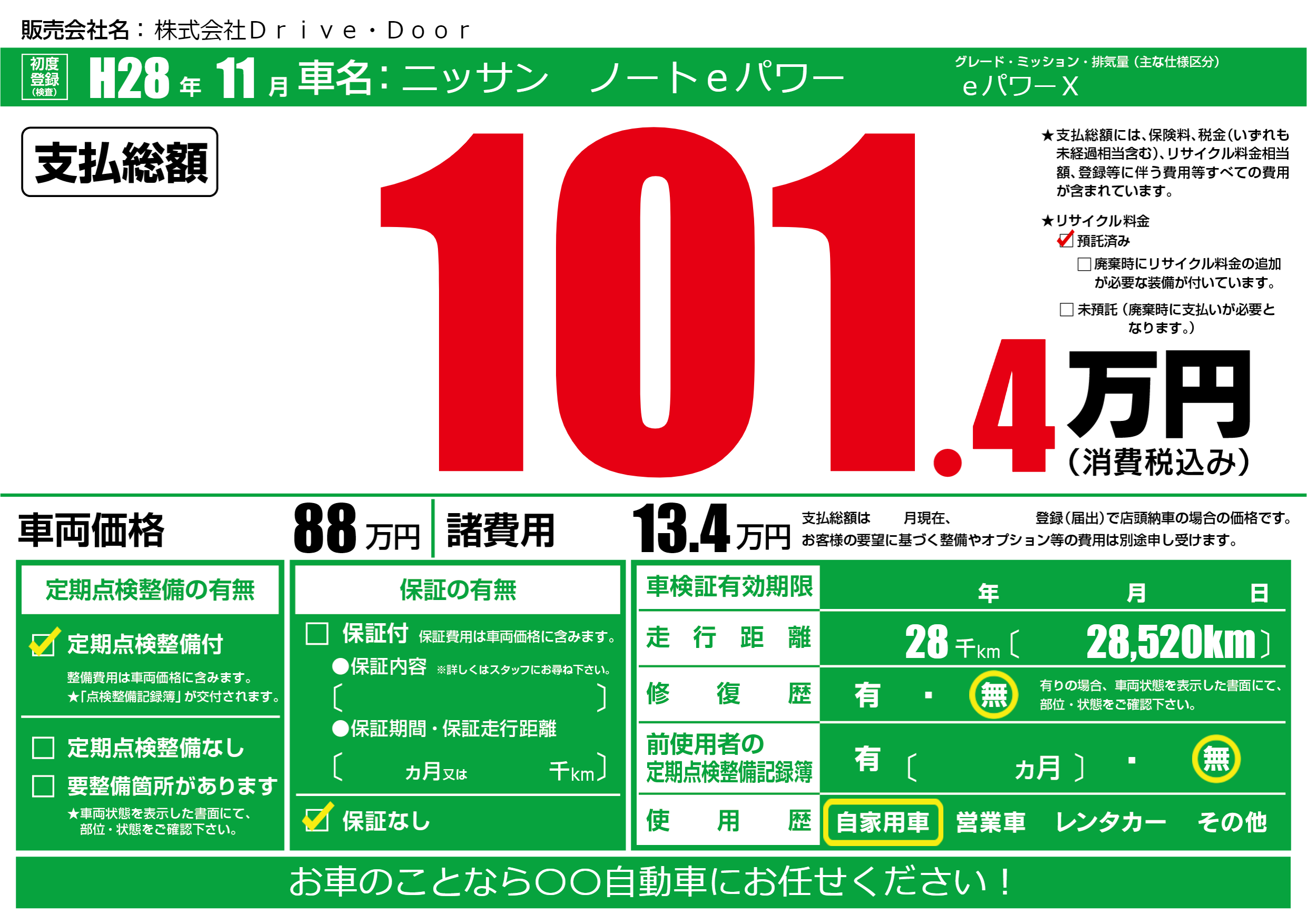 | 車名 | ニッサン ノートeパワー | グレード ミッション 排気量 |