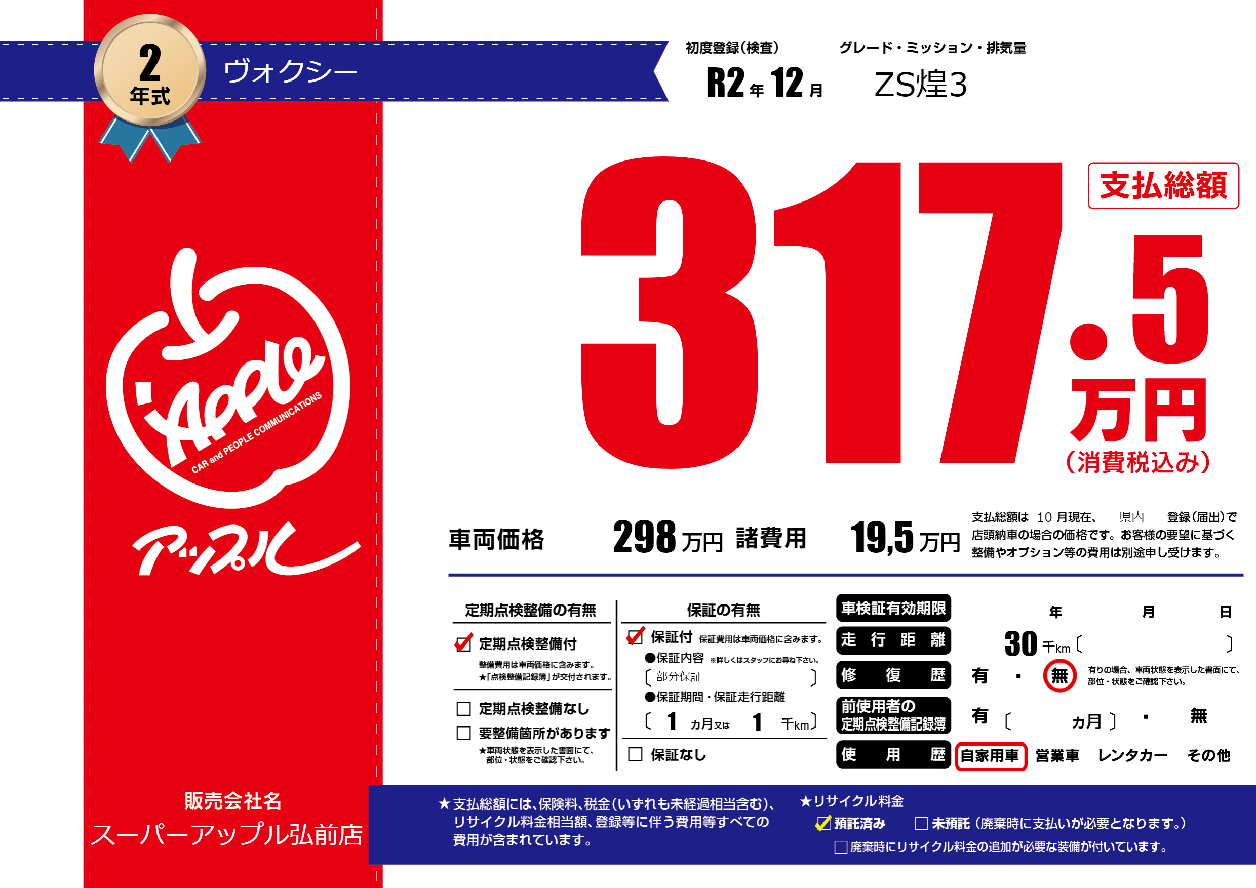 | 走行キロ | 3万km | 初年度登録 | R2年12月 |
