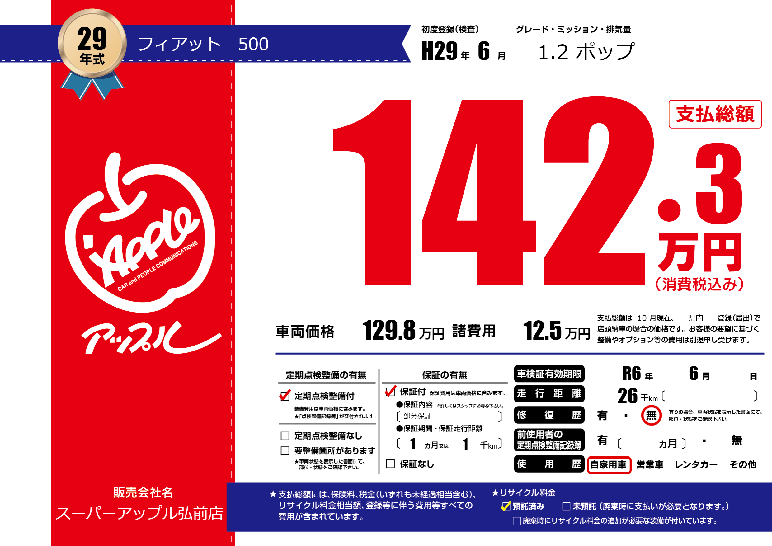 | 車名 | フィアット 500 | グレード ミッション 排気量 |