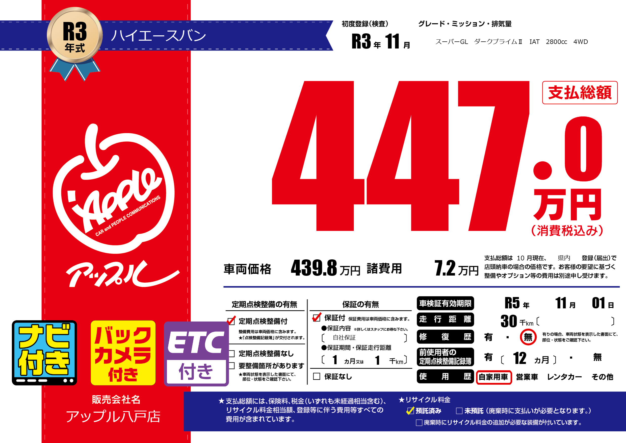 | 走行キロ | 3万km | 初年度登録 | R3年11月 |