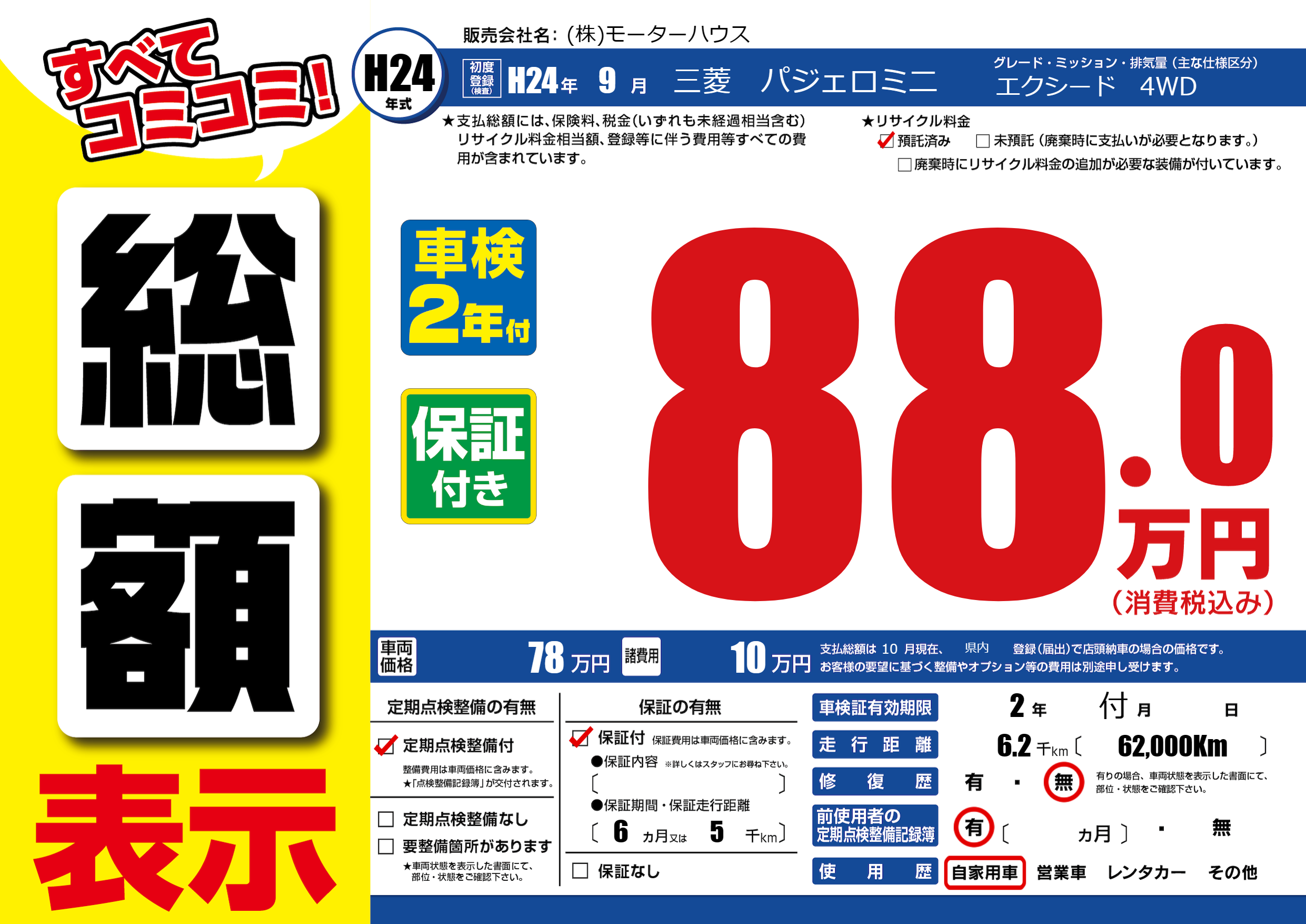 | 車名 | 三菱 パジェロミニ | グレード ミッション 排気量 |