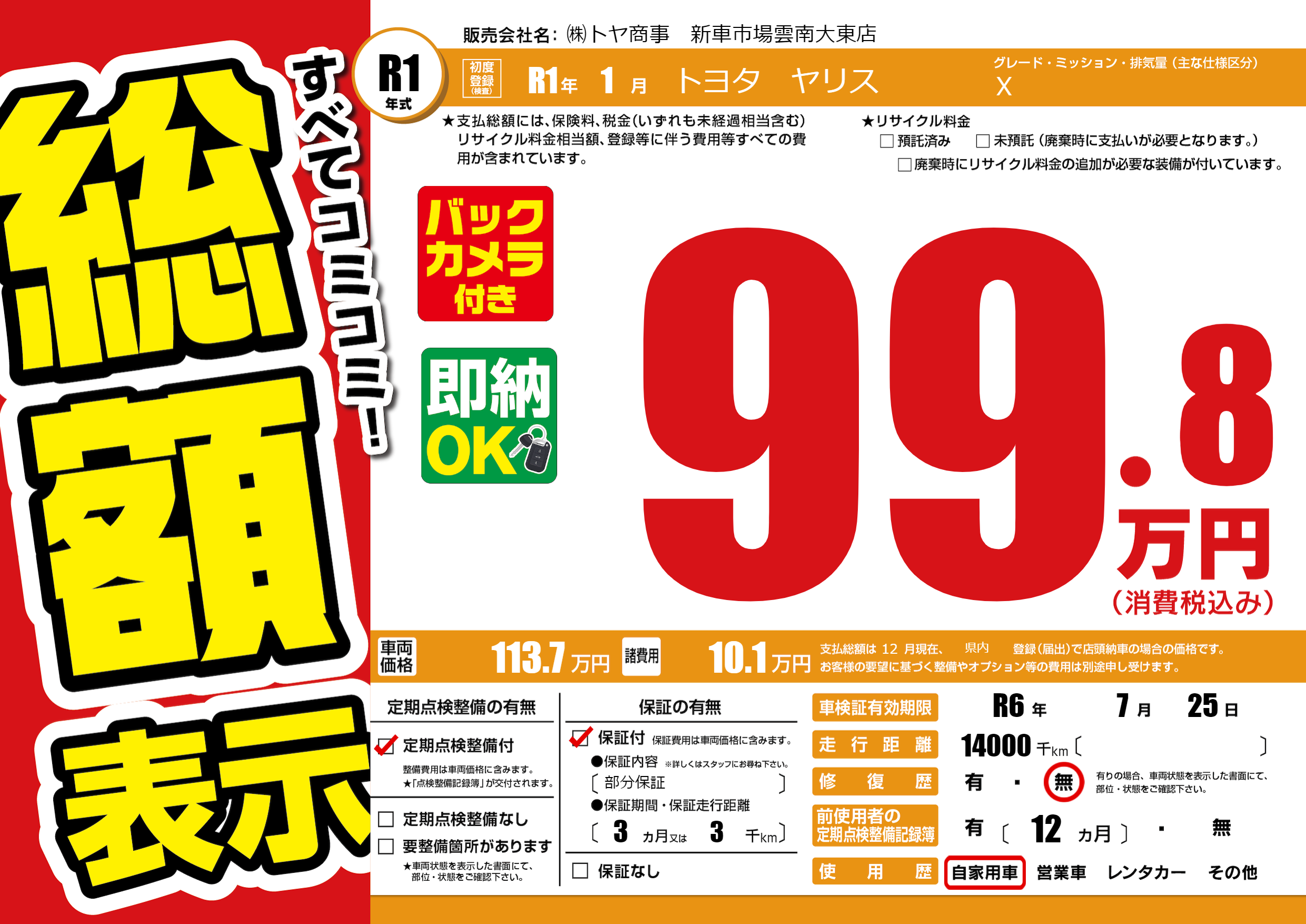 | 車名 | トヨタ ヤリス | グレード ミッション 排気量 |