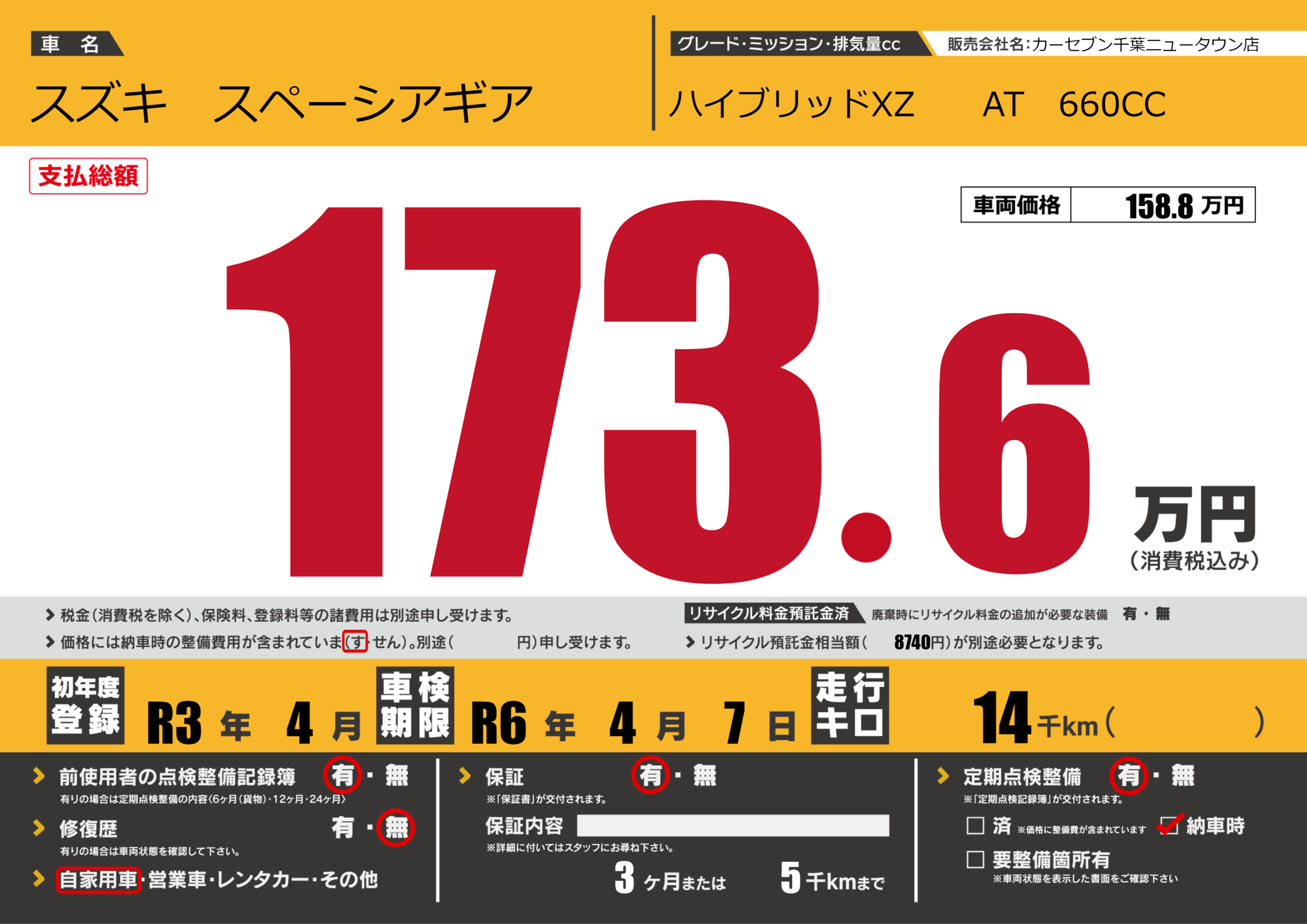 | 定期点検整備 | 定期点検整備あり 納車時あり | ||