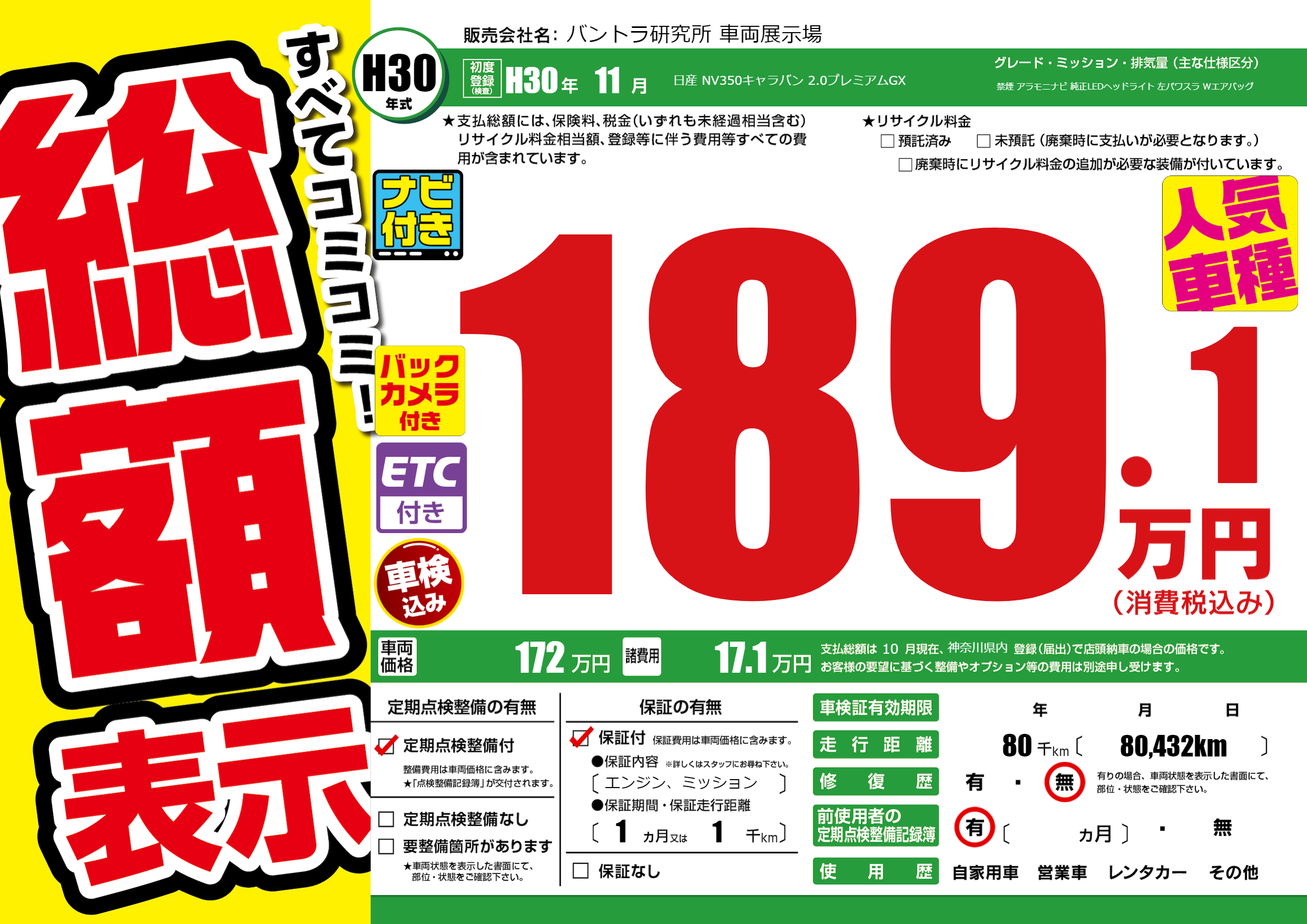 | 車名 | 日産 NV350キャラバン 2.0プレミアムGX | グレード ミッション 排気量 |