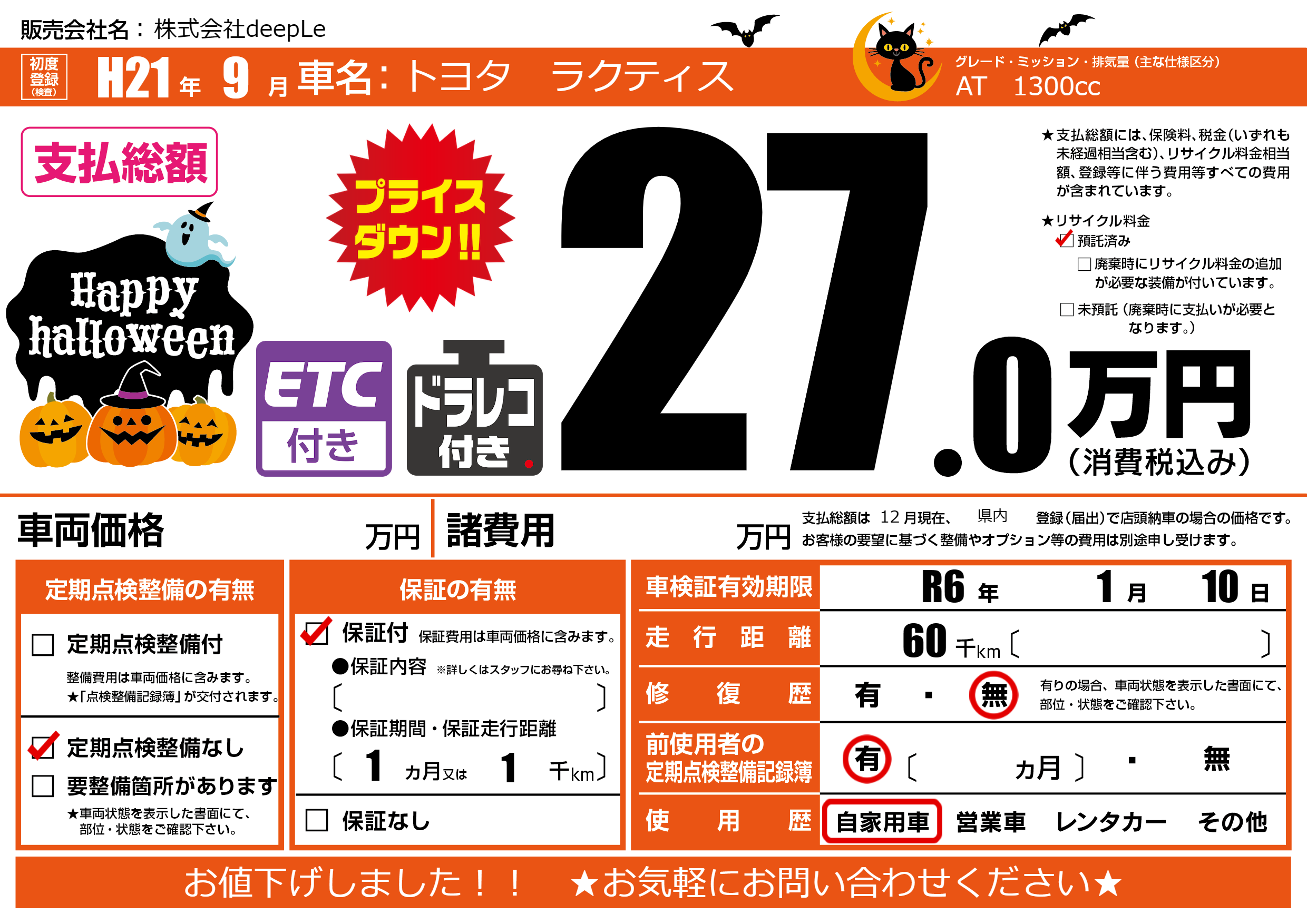 | 走行キロ | 6万km | 初年度登録 | H21年9月 |