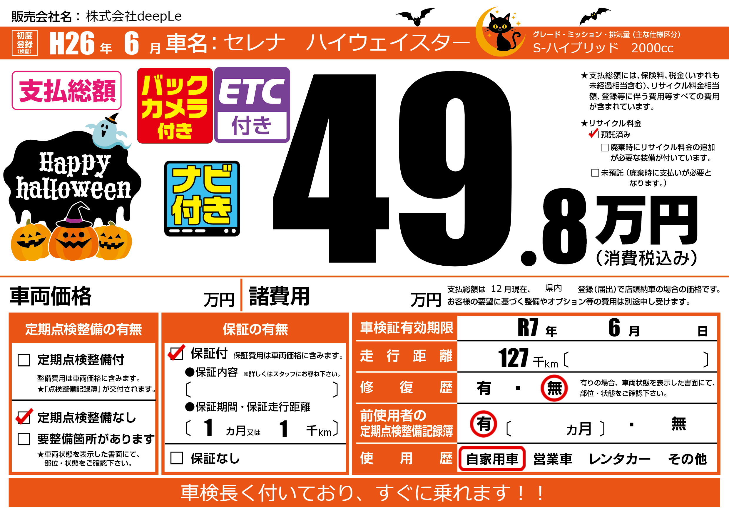 | 走行キロ | 12.7万km | 初年度登録 | H26年6月 |