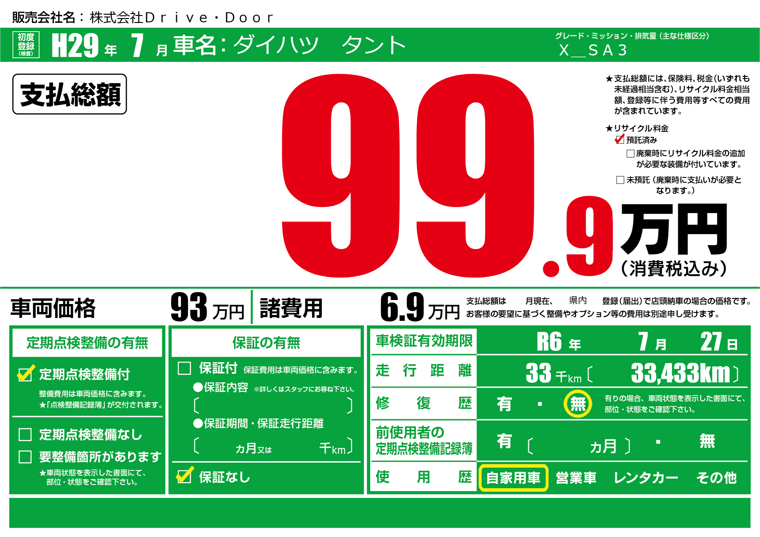 | 走行キロ | 3.3万km | 初年度登録 | H29年7月 |
