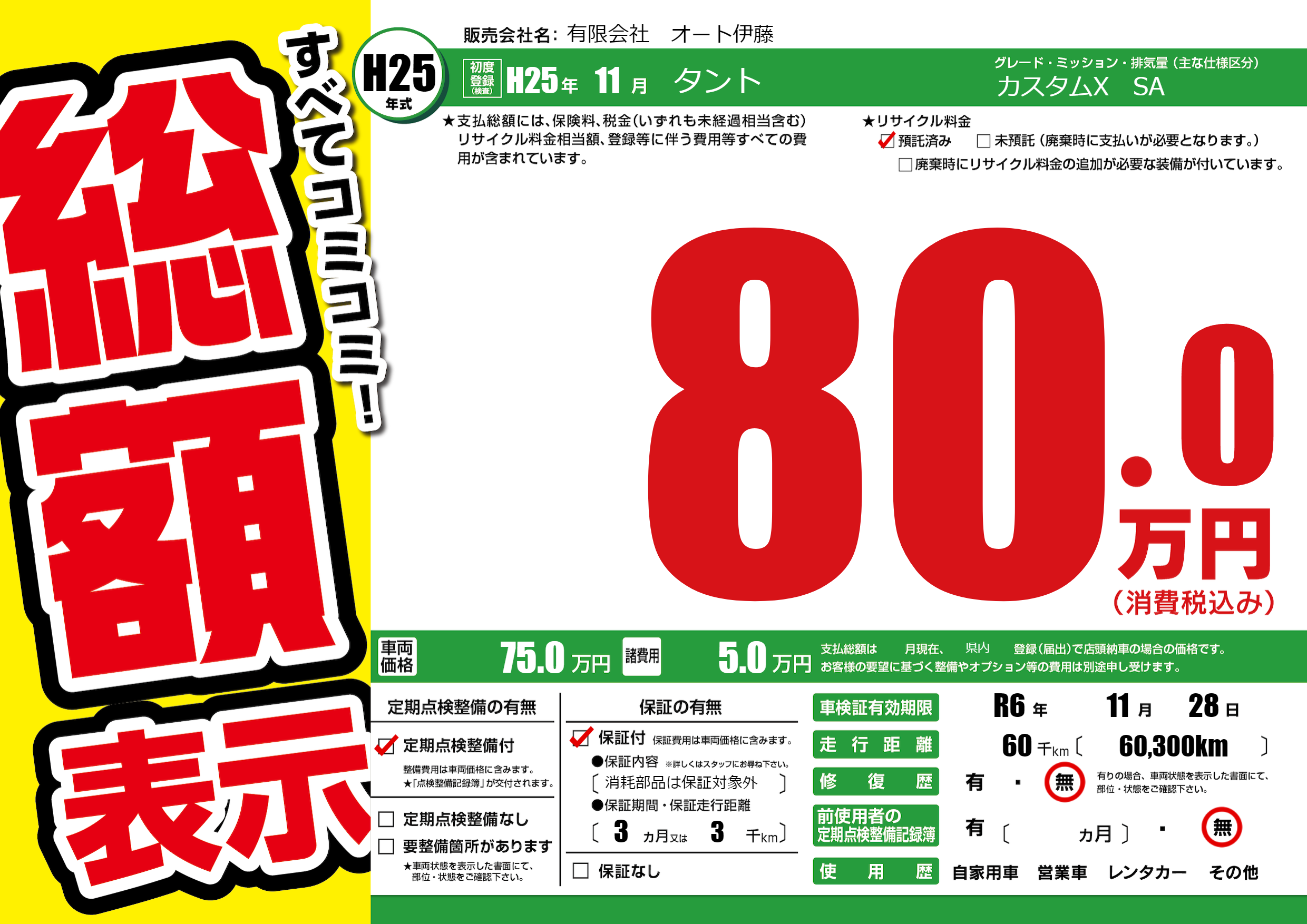 | 走行キロ | 6万km | 初年度登録 | H25年11月 |