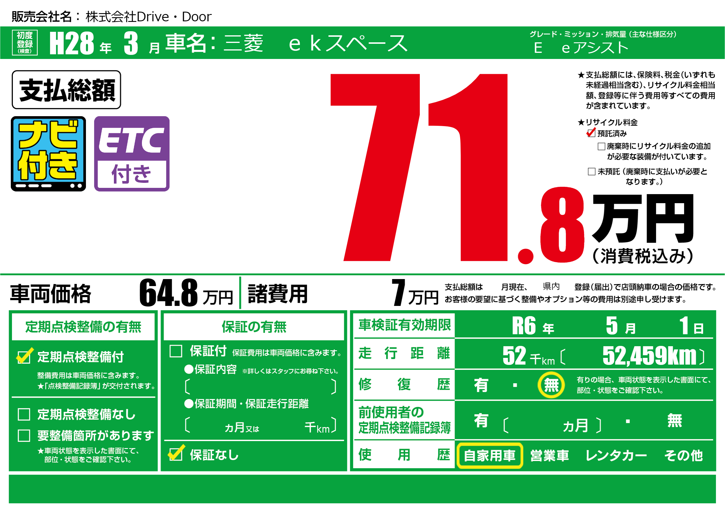 | 走行キロ | 5.2万km | 初年度登録 | H28年3月 |
