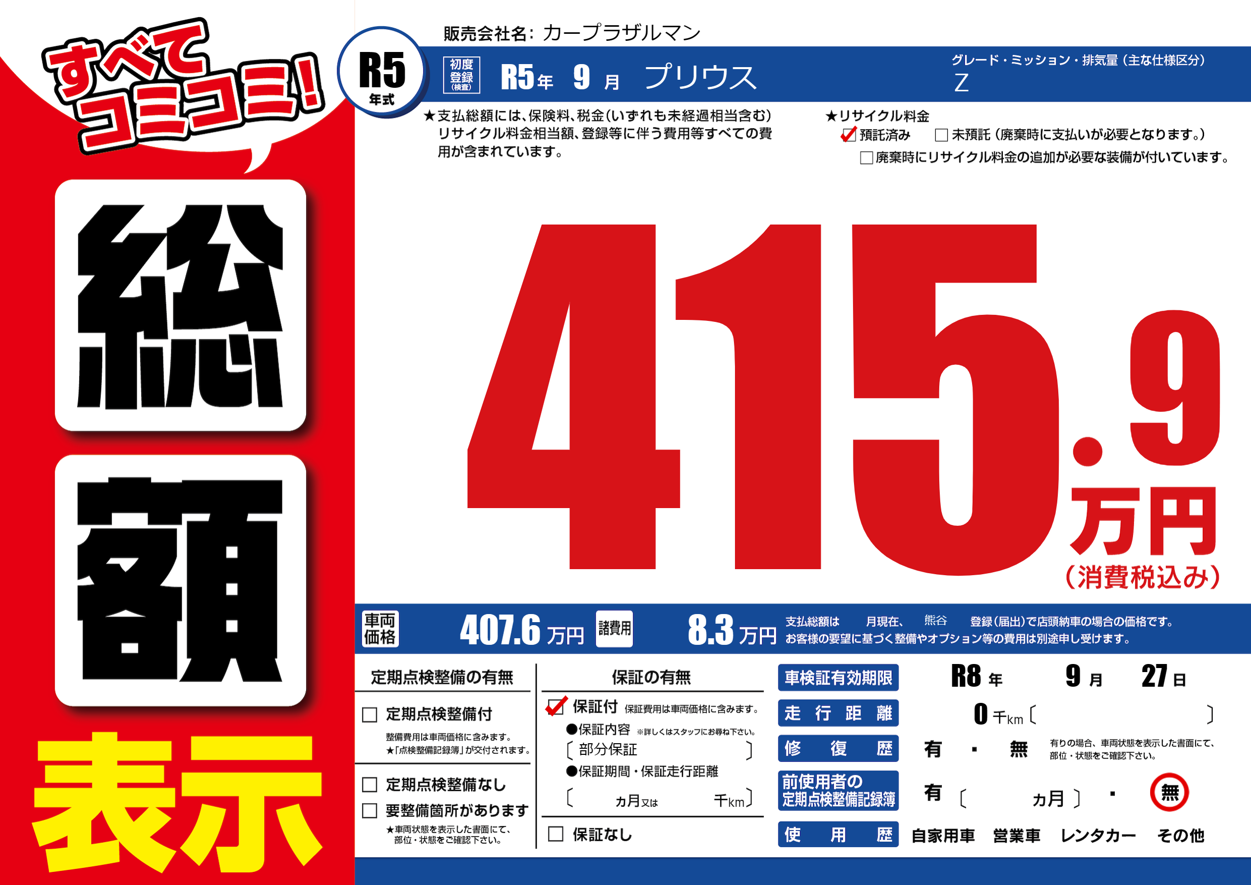 | 車名 | プリウス | グレード ミッション 排気量 |