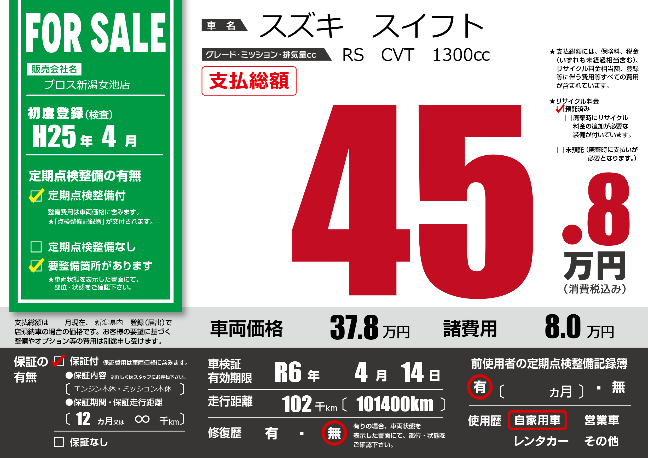 | 走行キロ | 10.2万km | 初年度登録 | H25年4月 |