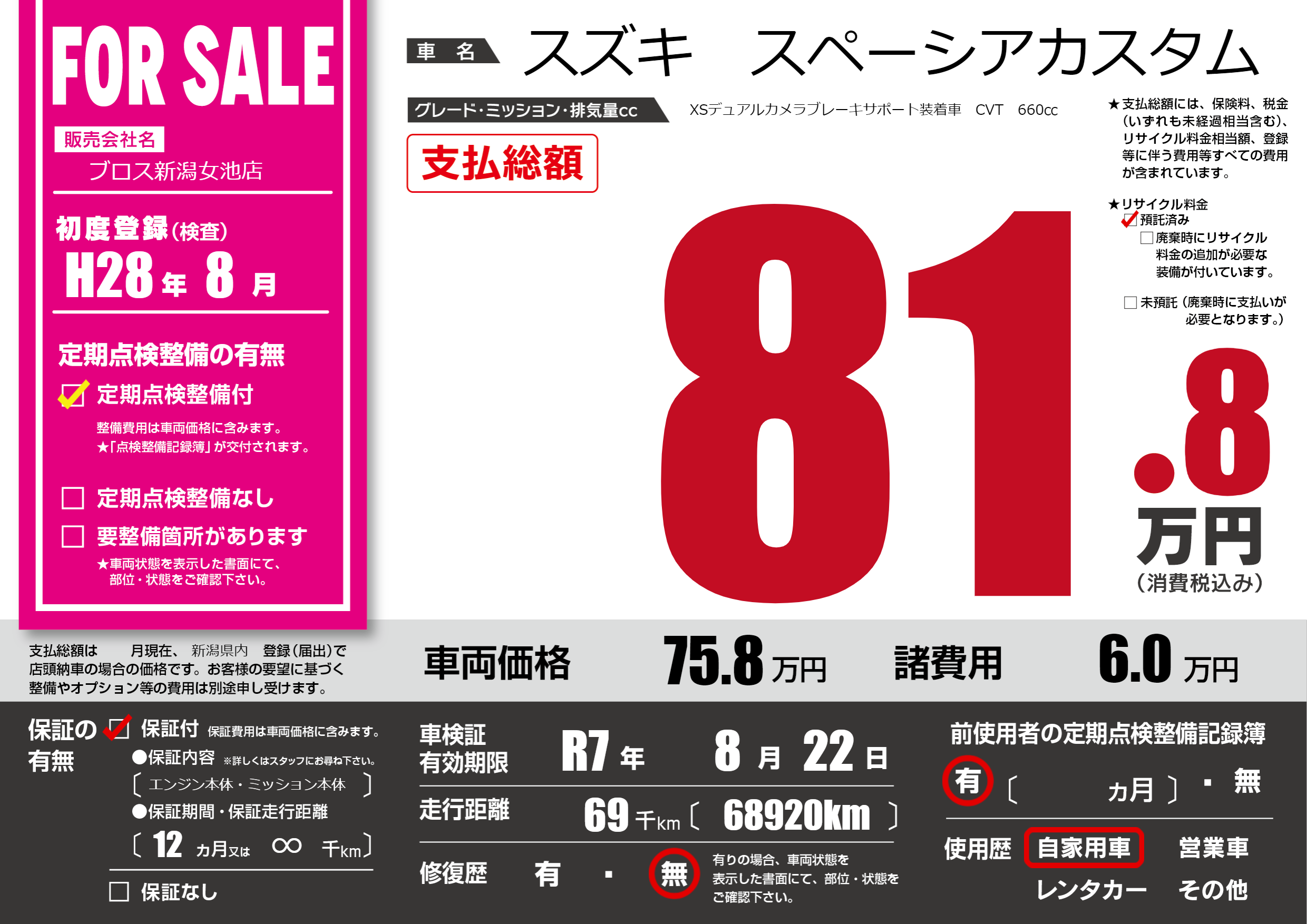 | 走行キロ | 6.9万km | 初年度登録 | H28年8月 |