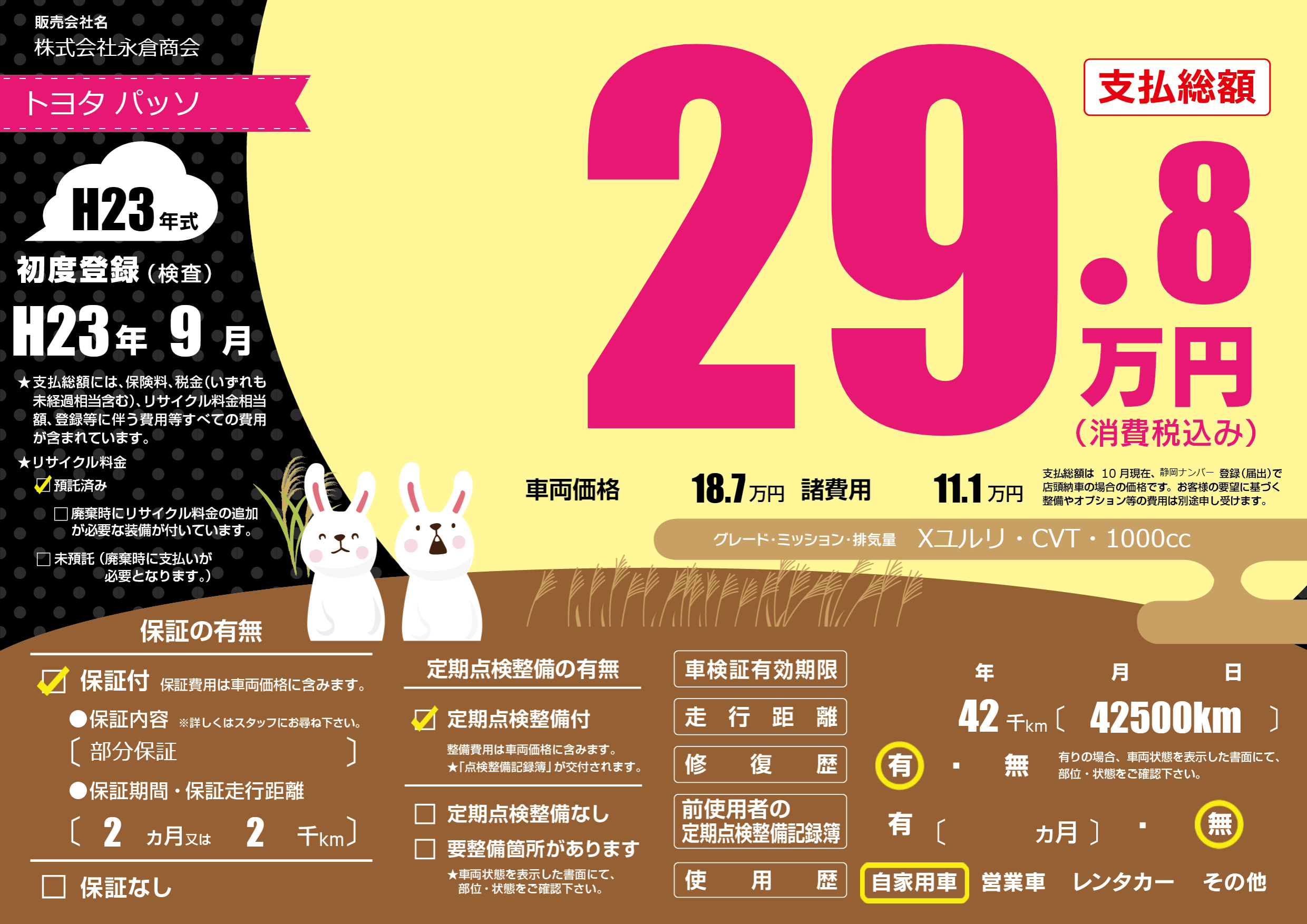 | 車名 | トヨタ パッソ | グレード ミッション 排気量 |