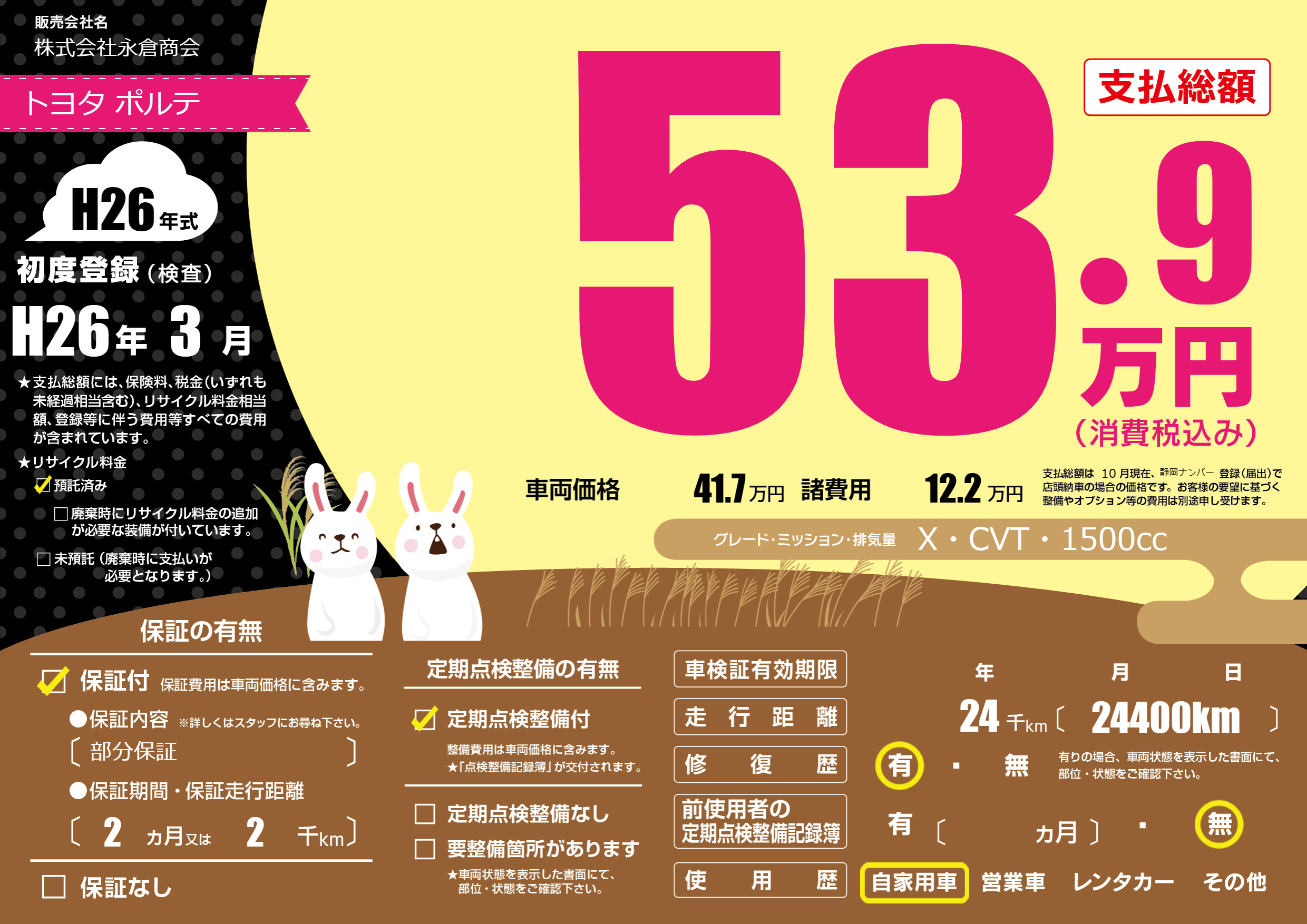 | 車名 | トヨタ ポルテ | グレード ミッション 排気量 |