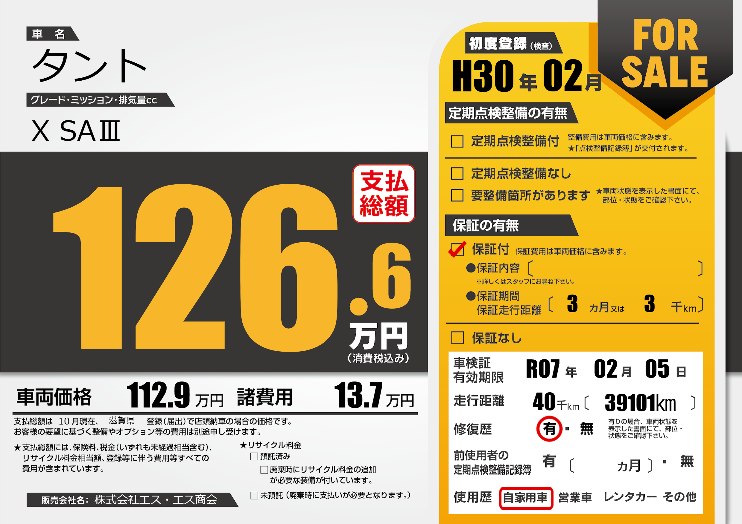 | 走行キロ | 4万km | 初年度登録 | H30年02月 |