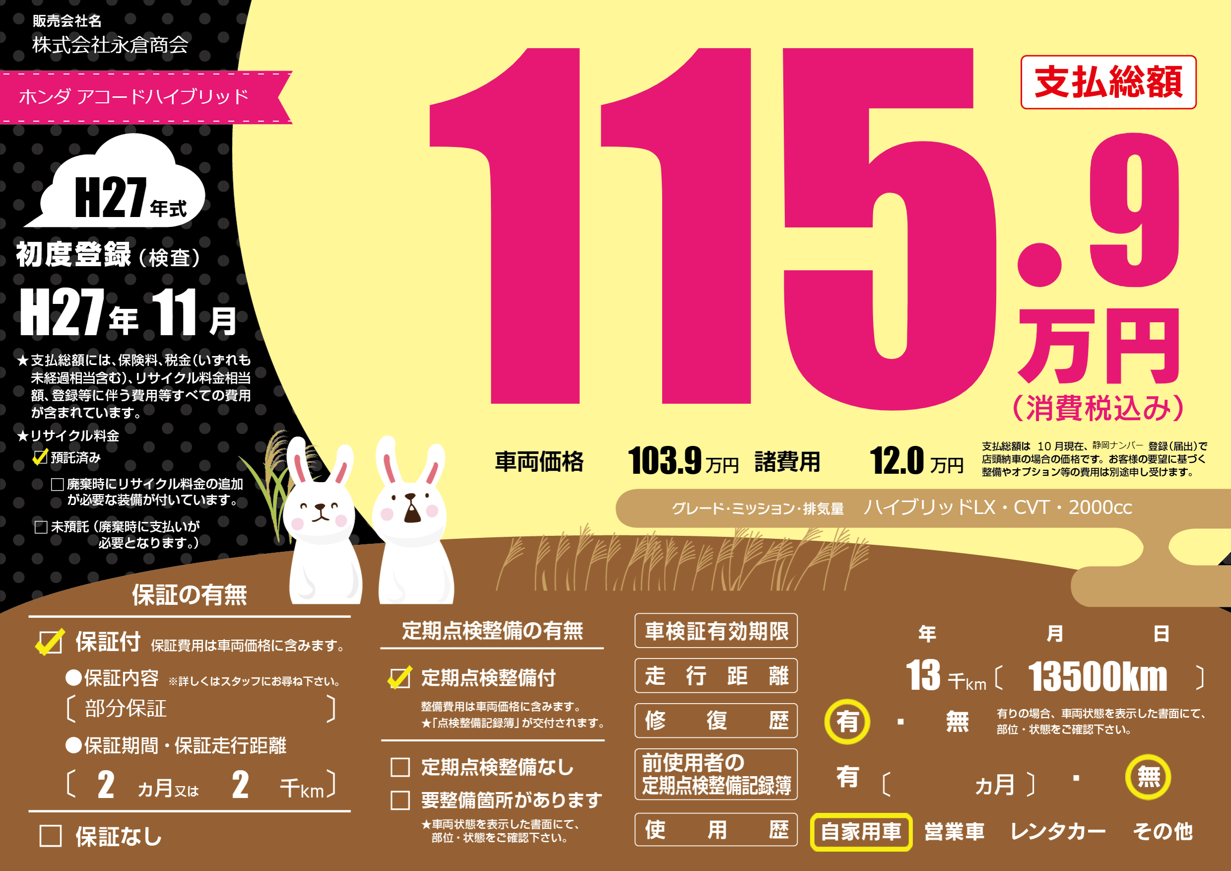 | 走行キロ | 1.3万km | 初年度登録 | H27年11月 |