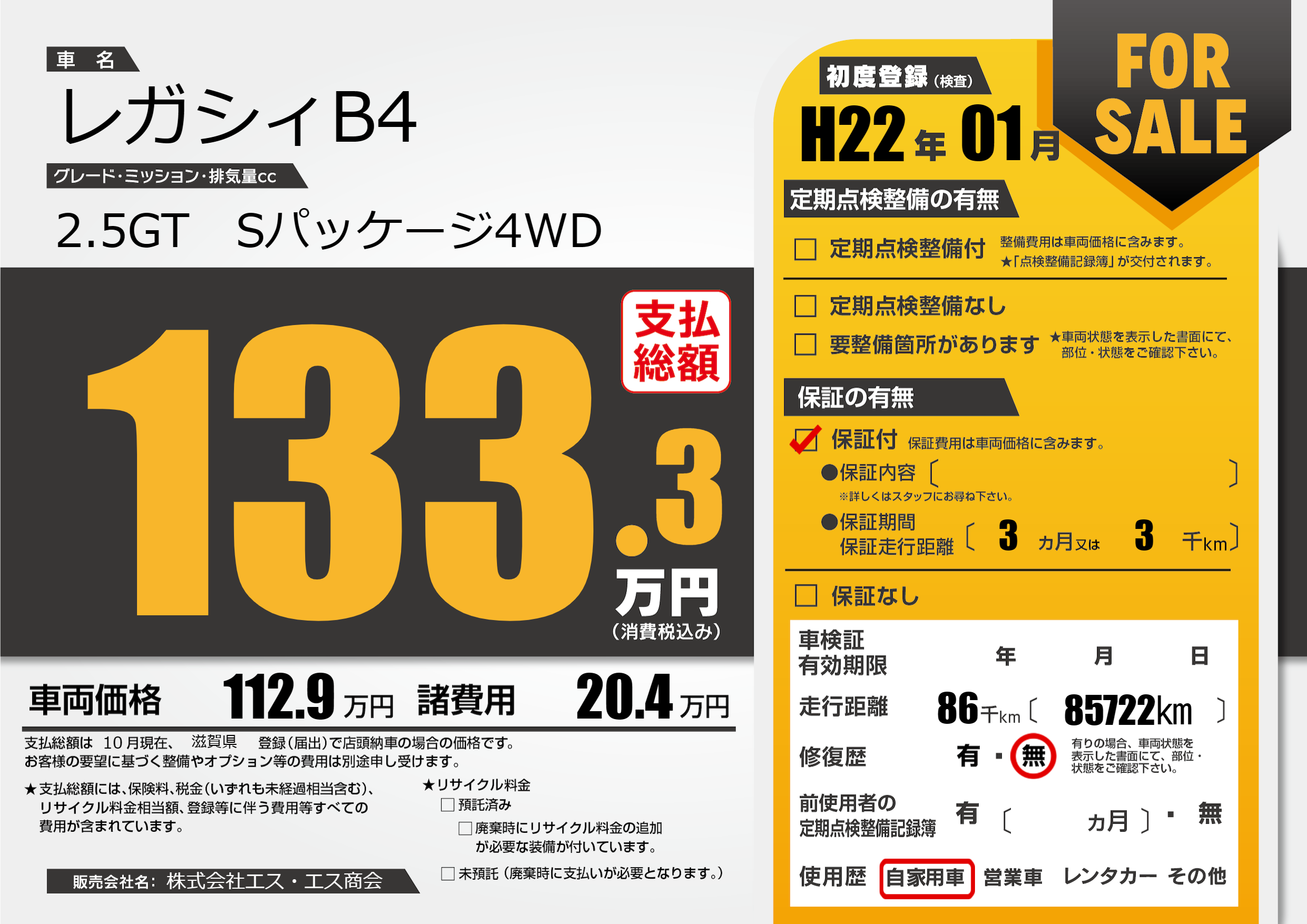 | 車名 | レガシィB4 | グレード ミッション 排気量 |