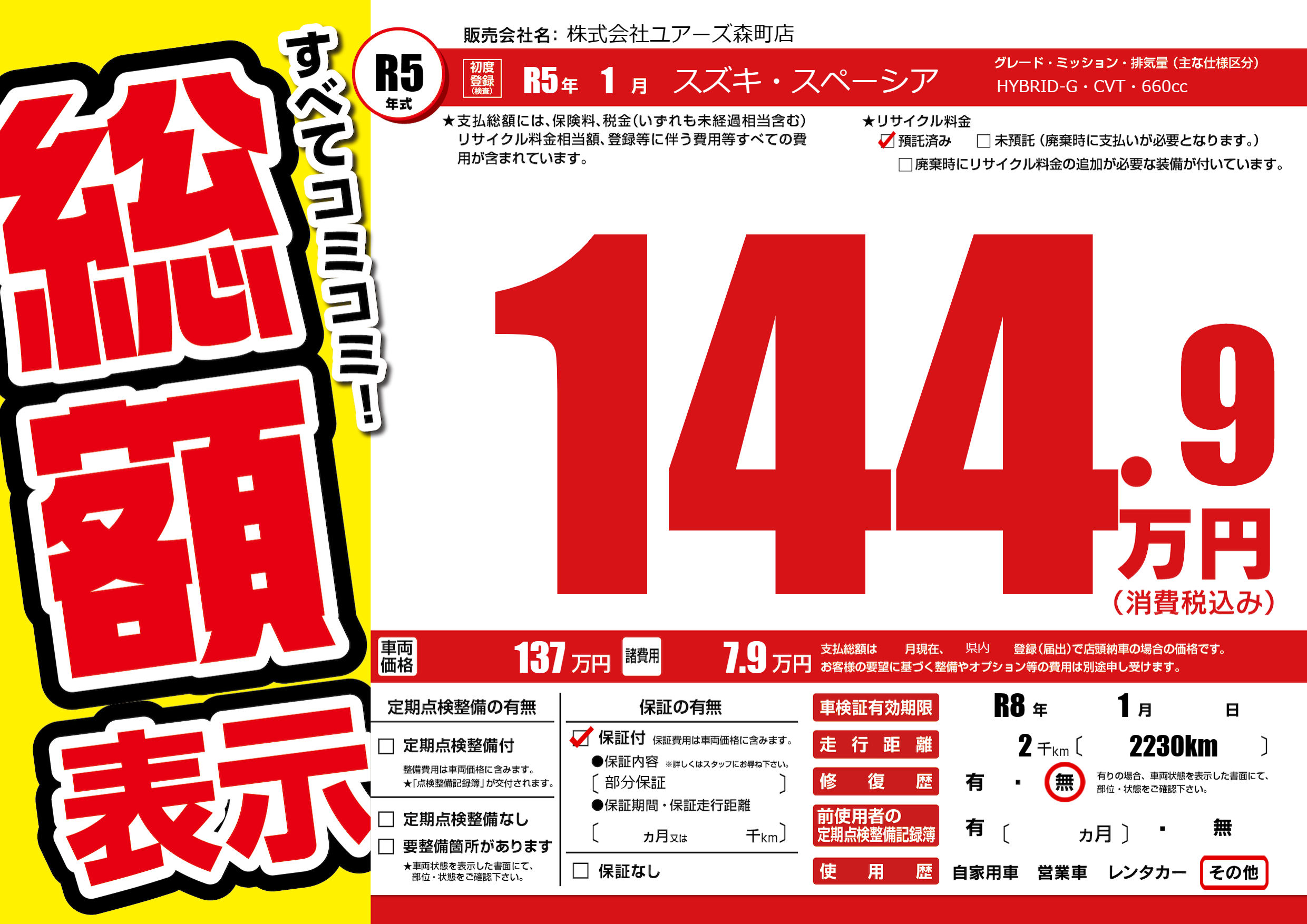 | 車名 | スズキ・スペーシア | グレード ミッション 排気量 |