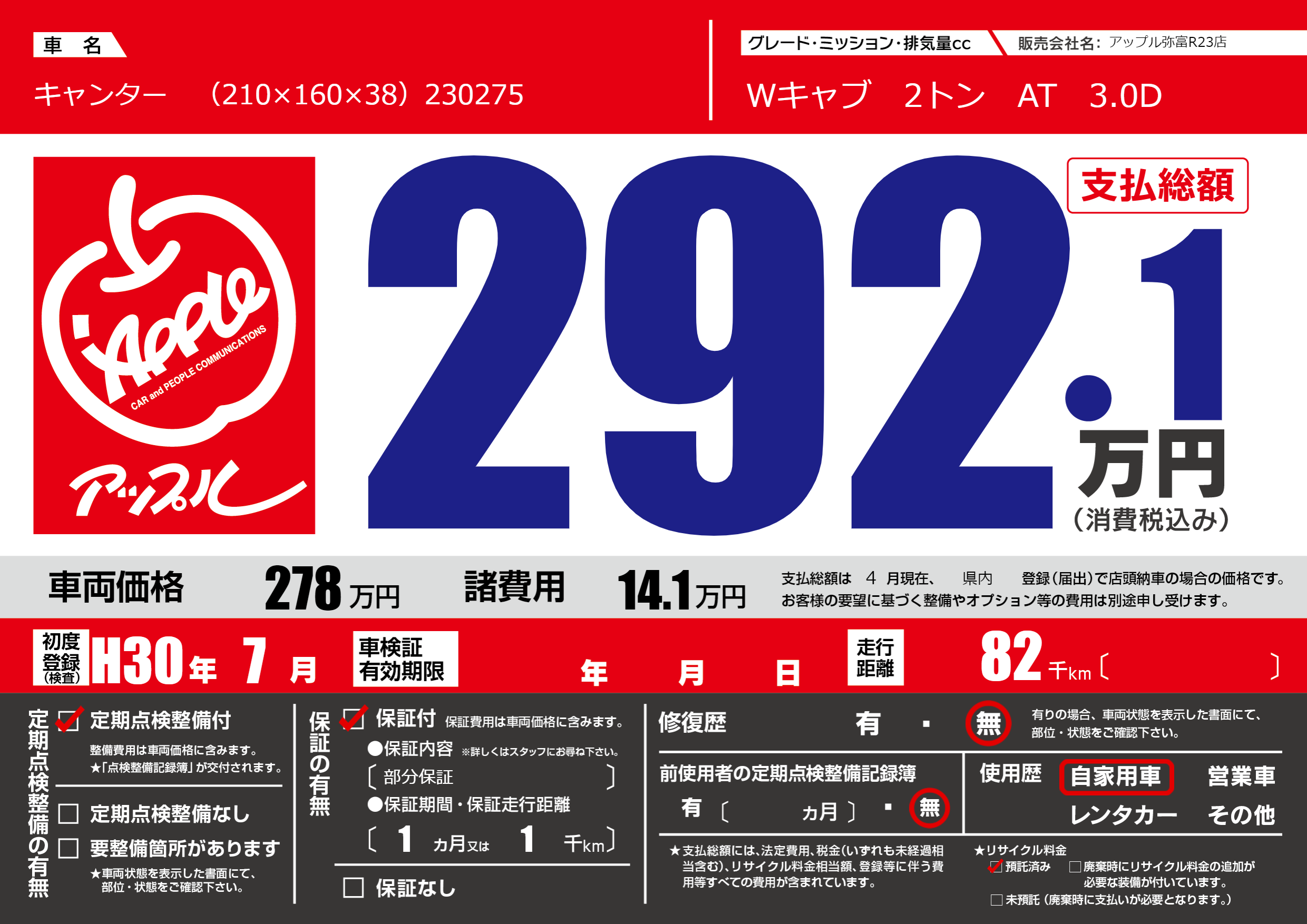 | 車名 | キャンター (210×160×38)230275 | グレード ミッション 排気量 |