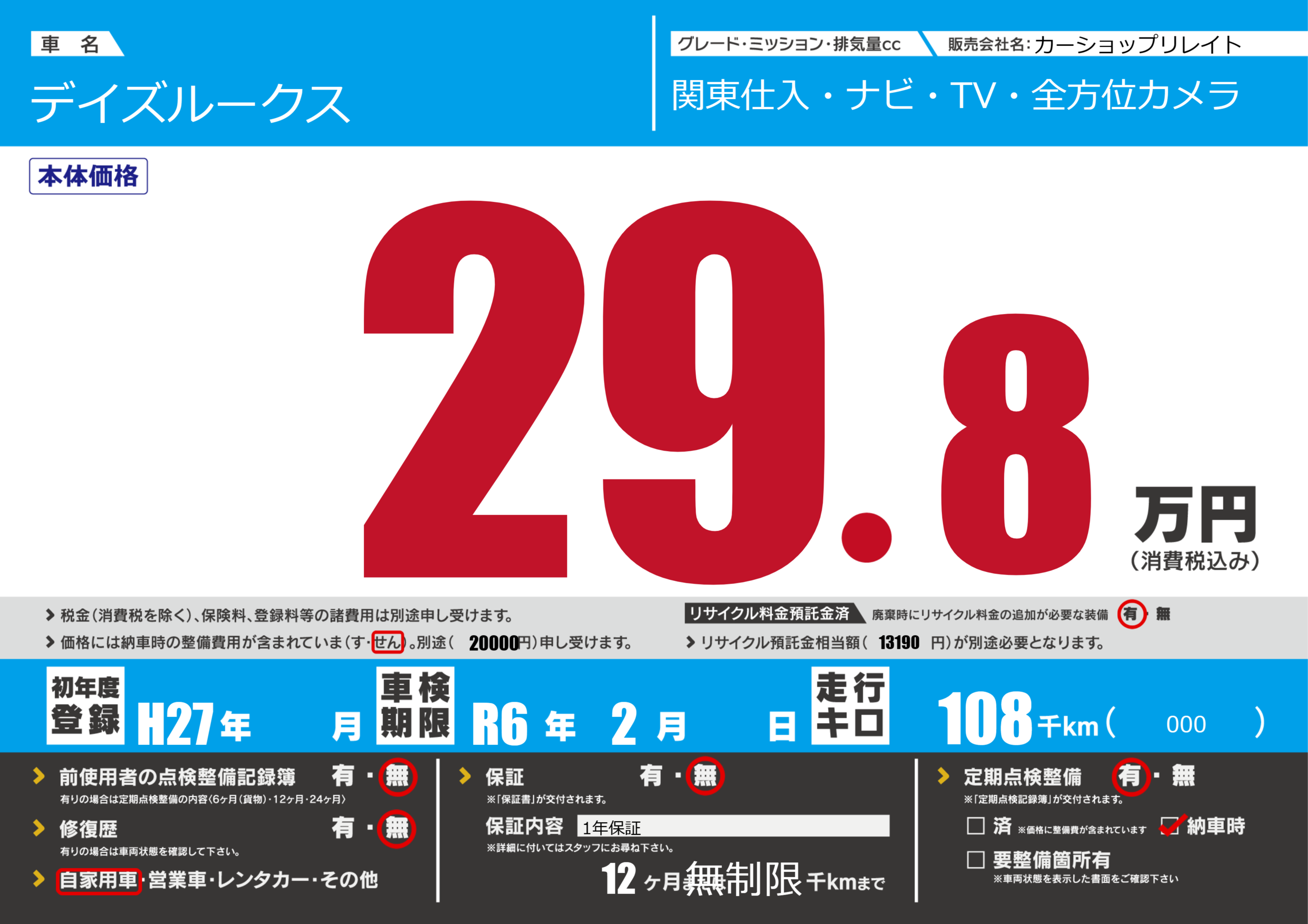 | 定期点検整備 | 定期点検整備あり 納車時あり | ||