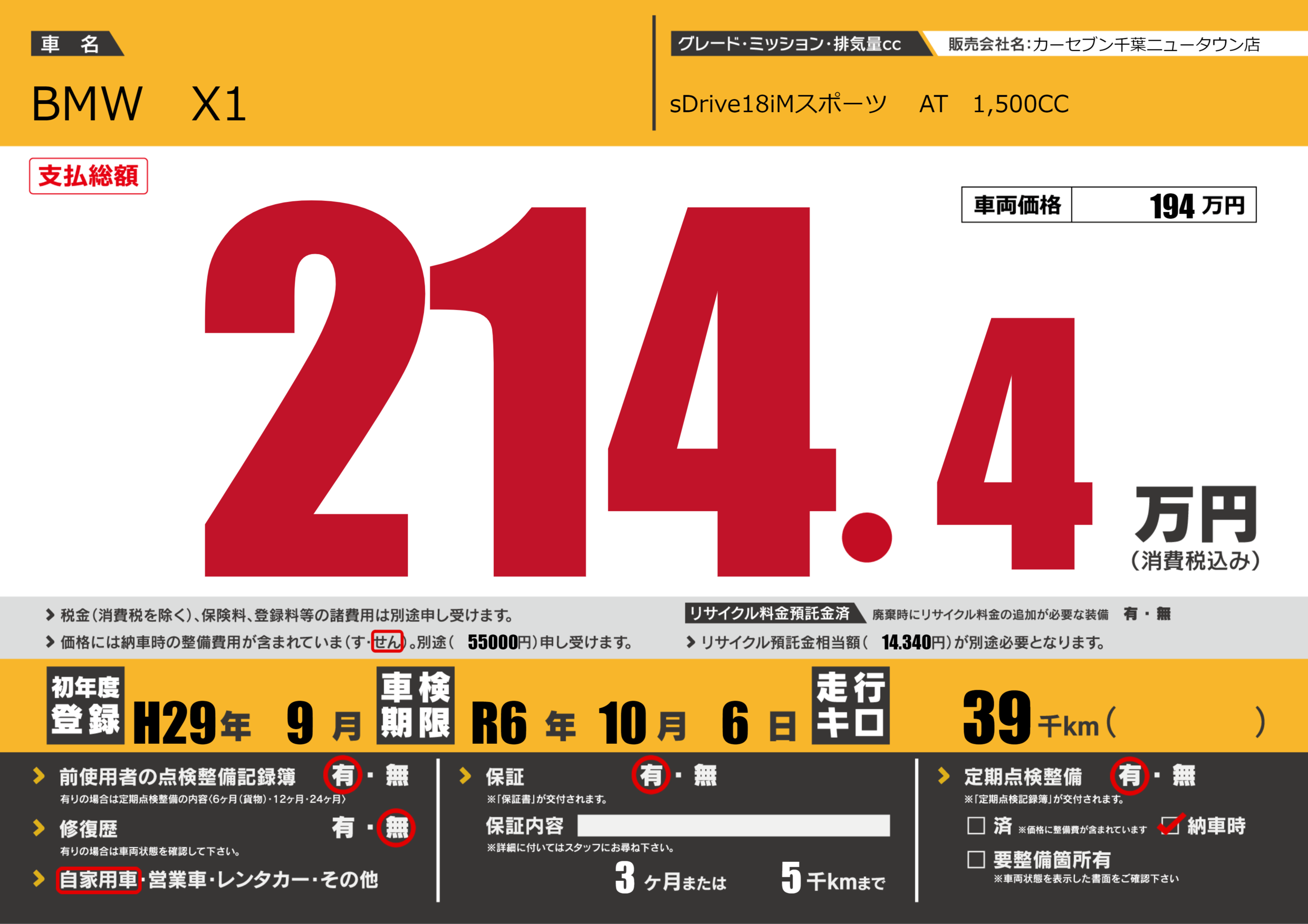 | 車名 | BMW X1 | グレード ミッション 排気量 |