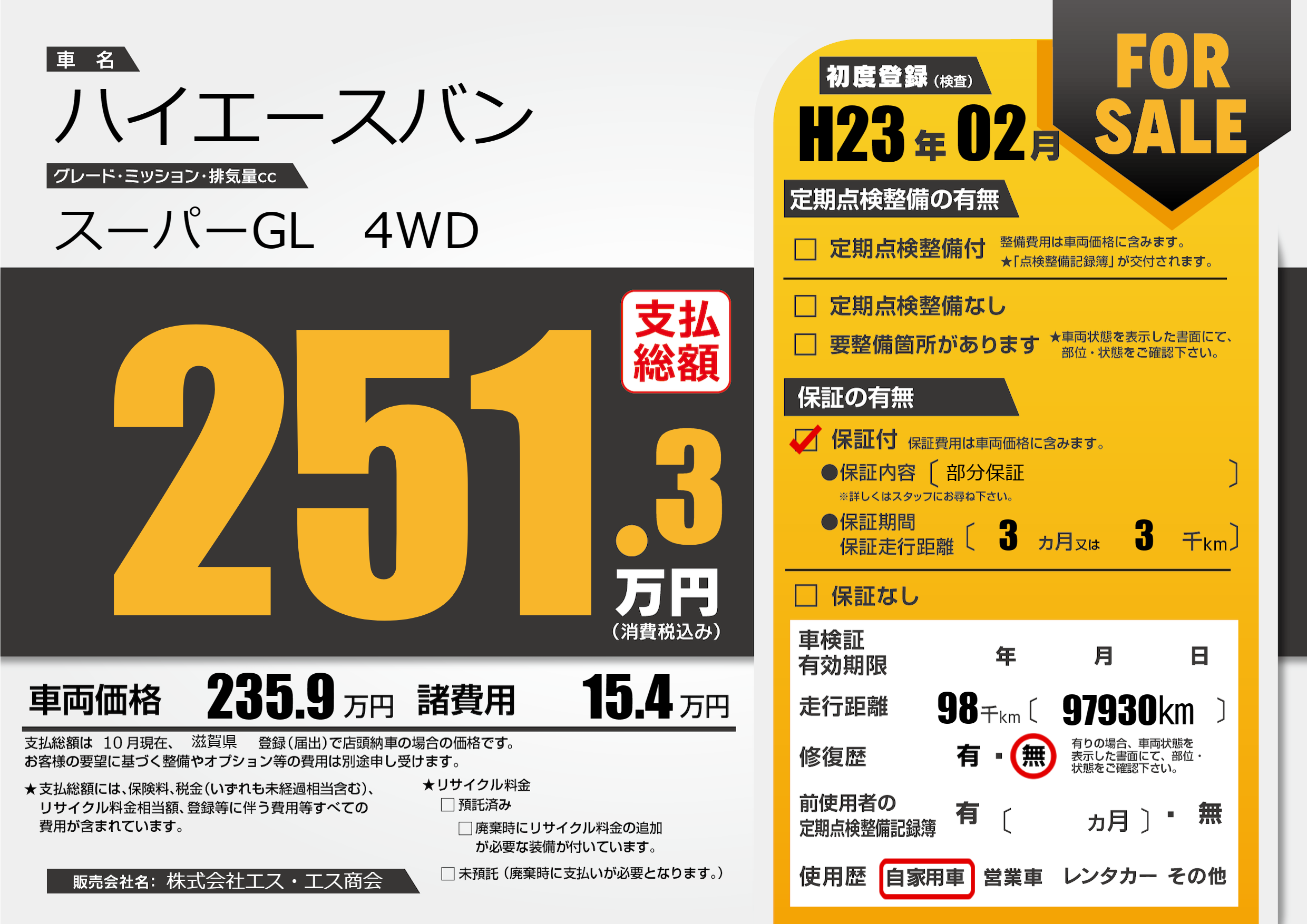 | 車名 | ハイエースバン | グレード ミッション 排気量 |