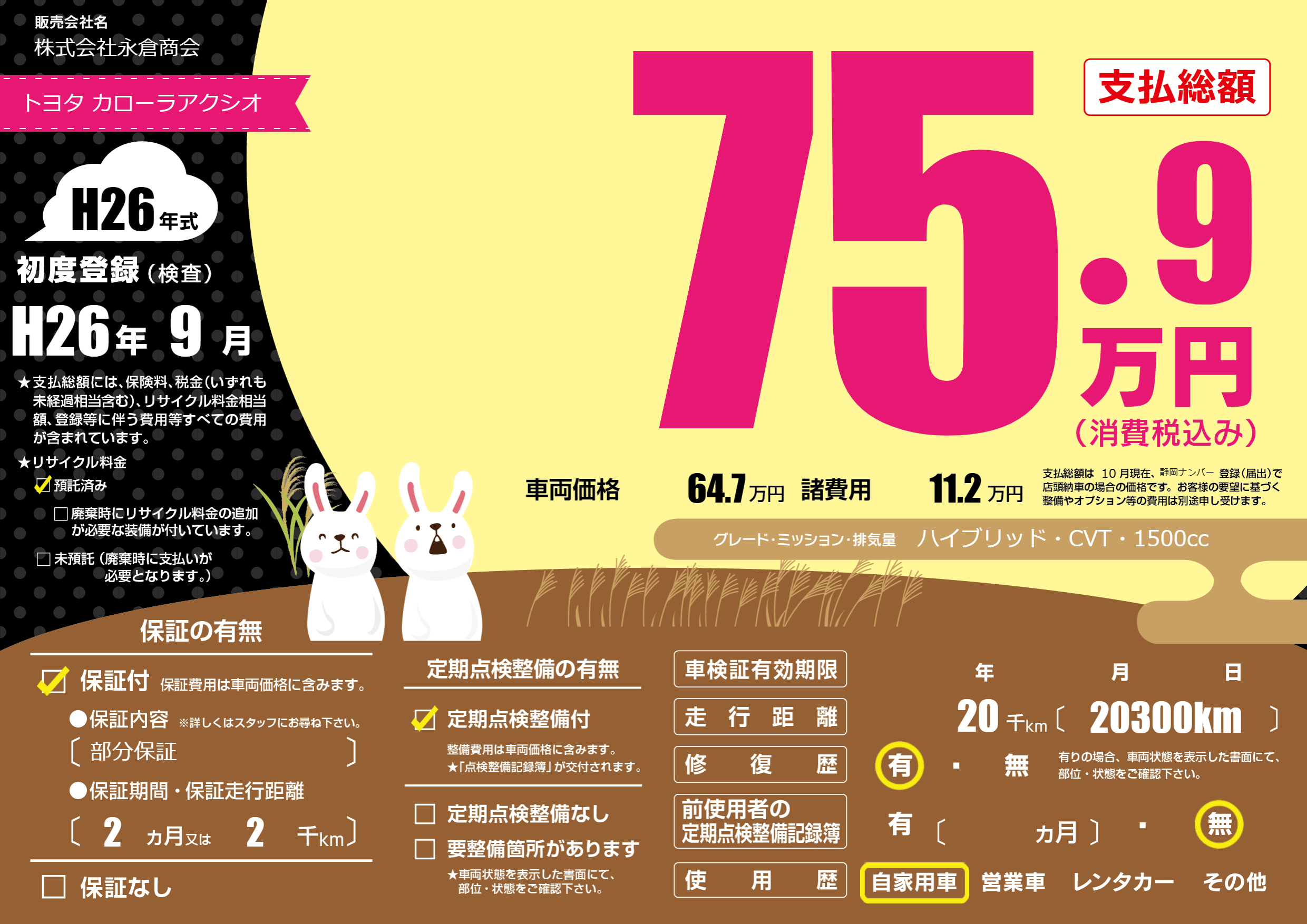 | 走行キロ | 2万km | 初年度登録 | H26年9月 |